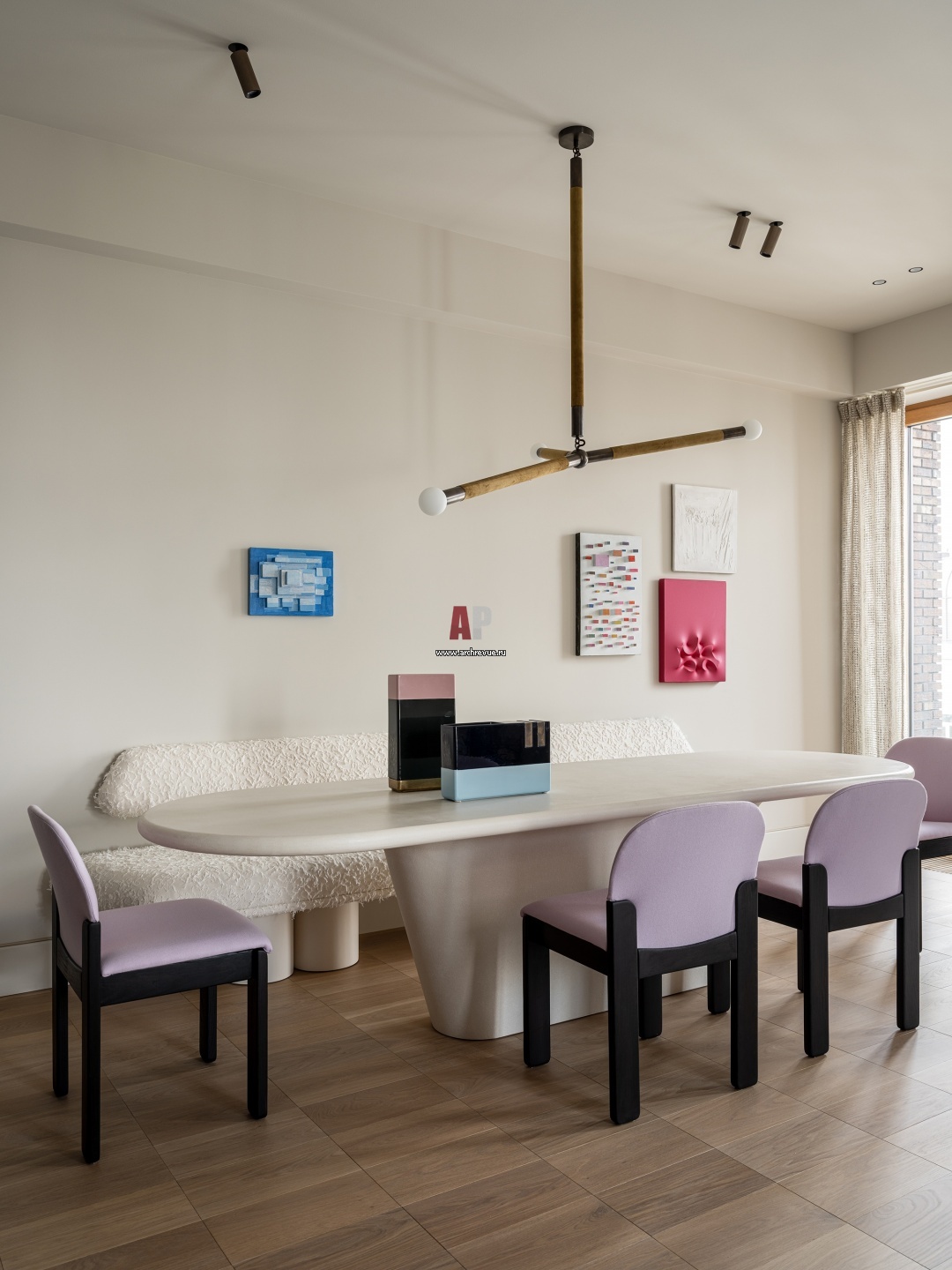 Обеденная группа. На стене – рельеф из серии «Орнаменты» и «Облако» №3, художник Игорь Шелковский. Объемная розовая работа, Giuzeppe Amadio. Белая работа, Борис Кочейшвили.