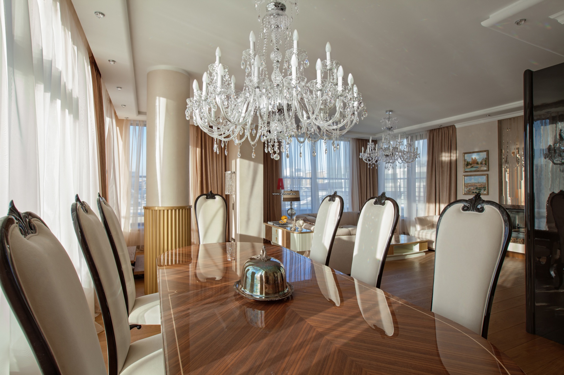 Интерьер объединенной гостиной в дизайне пентхауса в золотистых тонах с элементами ар-деко. Архитекторы стремились сохранить свет и воздух из панорамных окон. Стоолвый гарнитур в стиле ар-деко, Bruno Zampa.