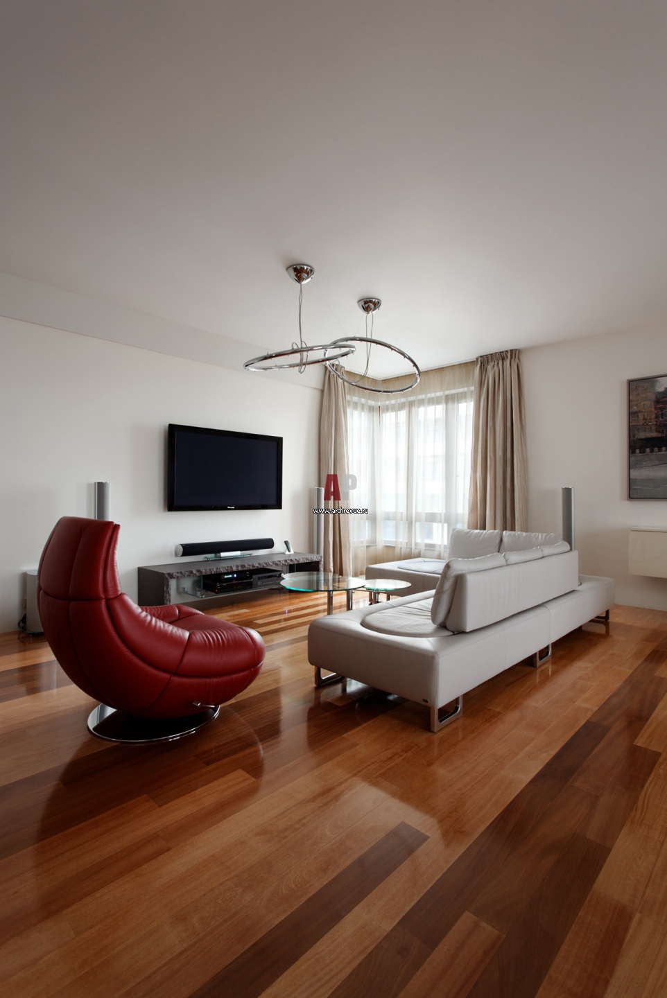На полах всех помещений в квартире – паркетная доска с экспрессивной, очень живописной фактурой. Она создает уют и привносит динамику.