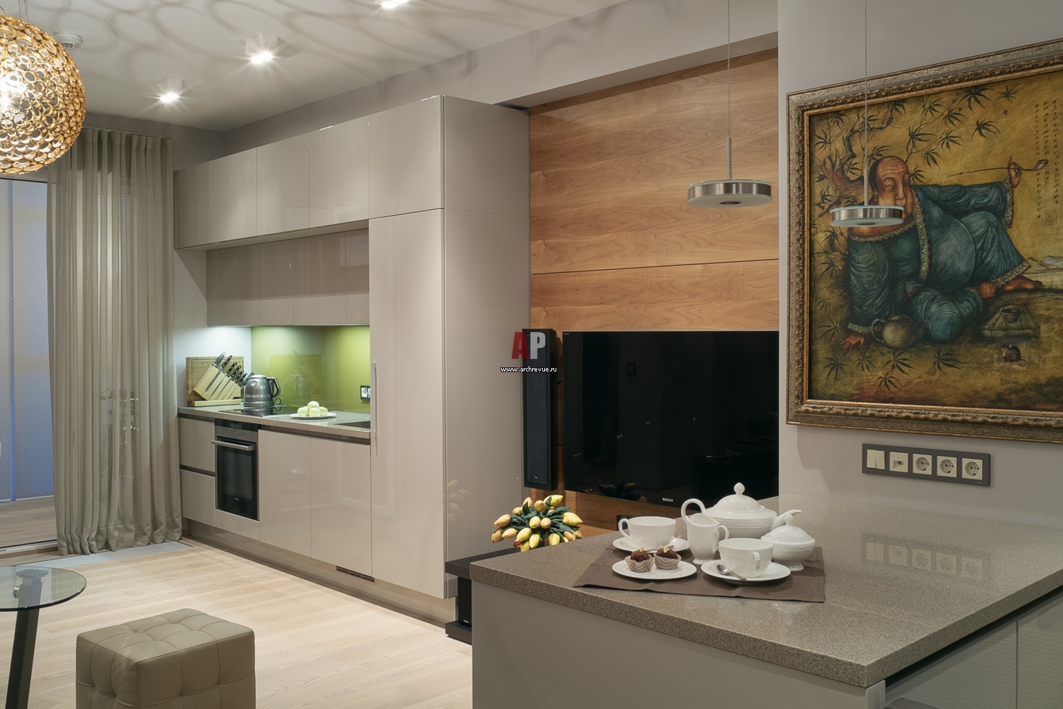 Дизайн-интерьера гостиной-кухни небольшой квартиры. Кухонный гарнитур и домашний кинотеатр расположены по одной стене. Кухня исполнена в светлом глянце, стена за плазменным экраном зашита деревянными панелями. Живопись художника Валерия Миронова.