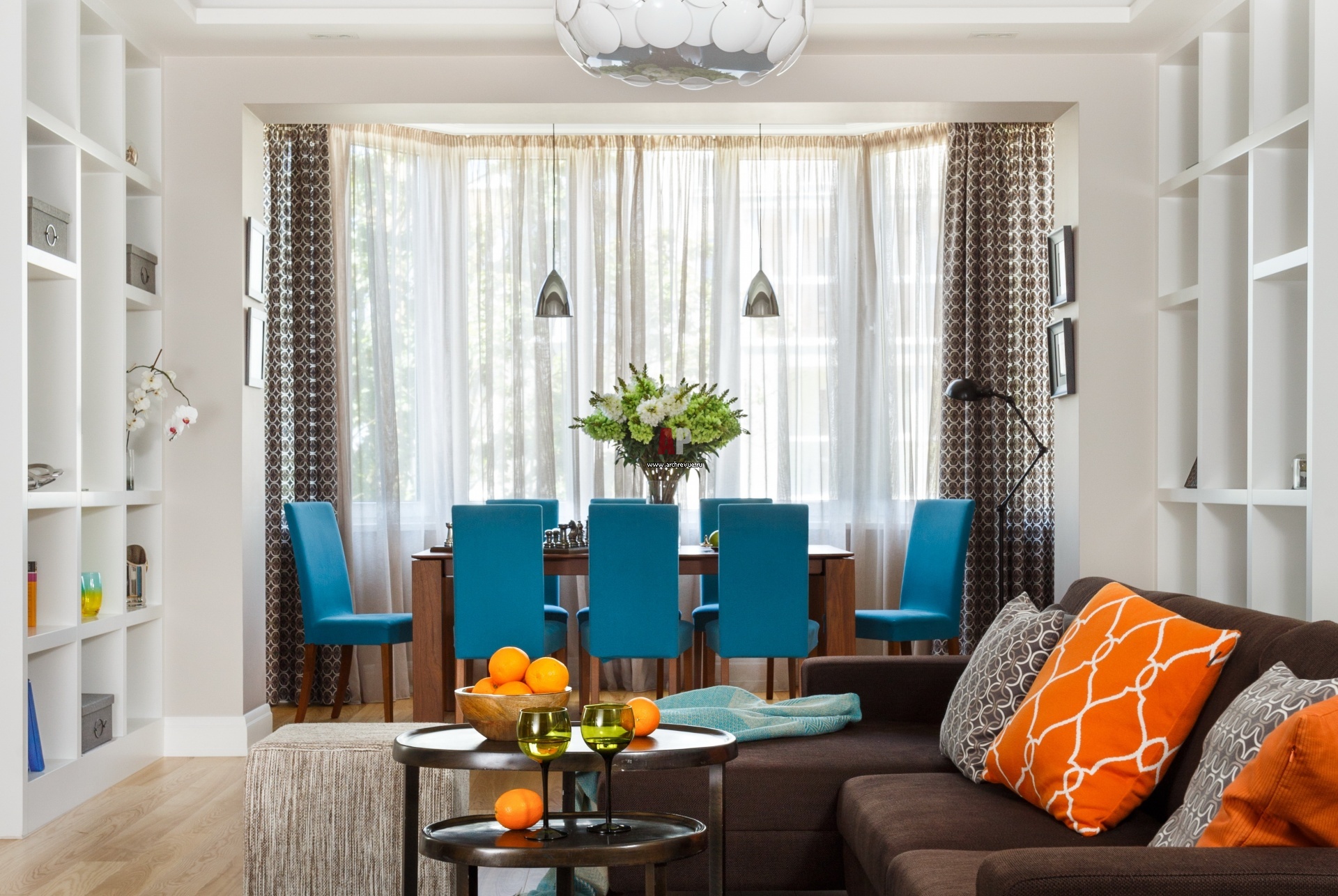 Обеденная зона расположена в эркере общей гостиной. В дизайне мебели и текстиля читаются отсылки к американским и скандинавским интерьерам.