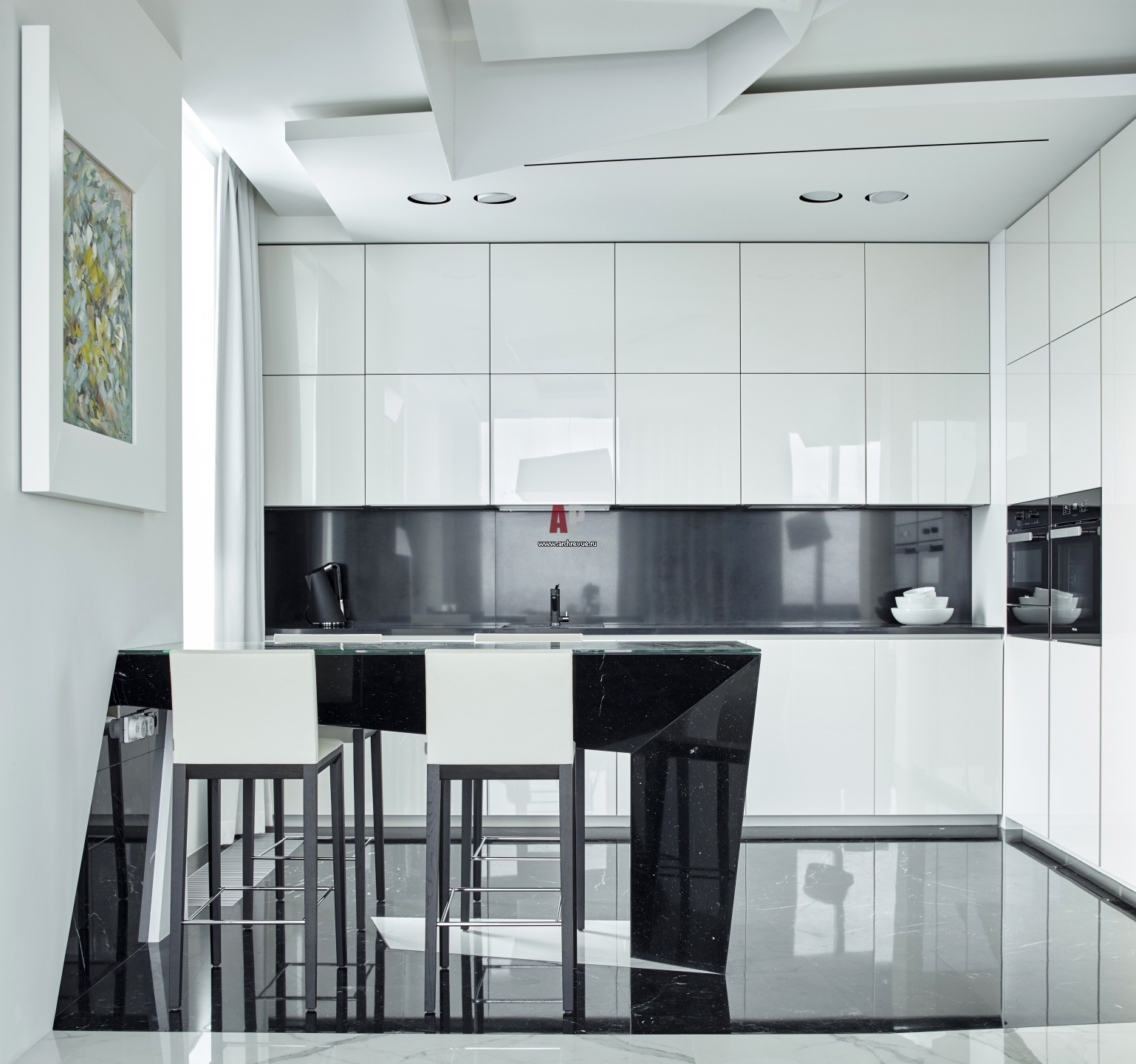Белоснежная кухня включена в объем гостиной. Стол сделан по чертежам авторов проекта. Его конфигурация повторяет форму потолочных светильников и мраморных плит на полу. Кухня, Maistri, модель Viva. Барные стулья, Walter Knoll, модель Andoo.