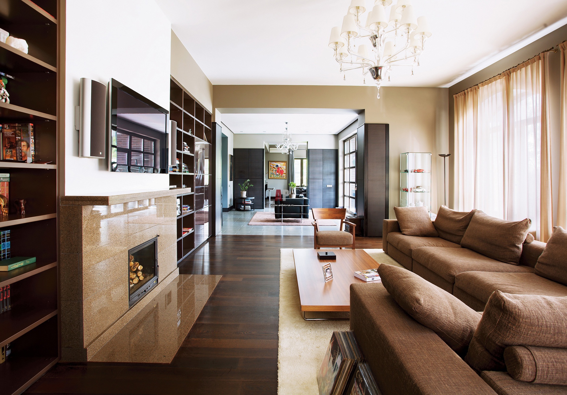 Интерьер зоны библиотеки с камином. Портал современного камина облицован полированным мрамором бежевого цвета. На белом дымоходе смонтирован плазменный экран с акустическими динамиками.