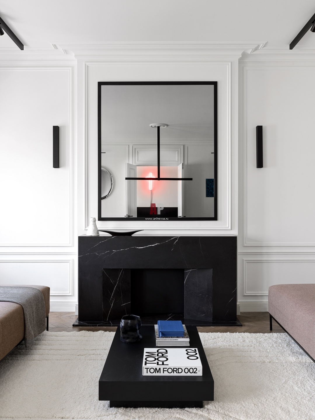 Камин имеет лаконичную и брутальную форму. Широкий портал изготовлен из черного мрамора Alexandra Black. В зеркало над камином встроен ТВ-экран. Хозяева любят смотреть фильмы и слушать музыку, но вид телевизора не портит общую эстетическую задумку.