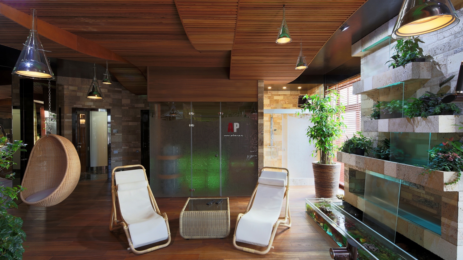 Домашний СПА-салон включает в себя зону отдыха с водопадом и камином, тренажерный зал и сауну с душевой. Они отделены стеклянными перегородками с матовым рисунком. Потолки подшиты волнообразными реечными панелями из дерева.