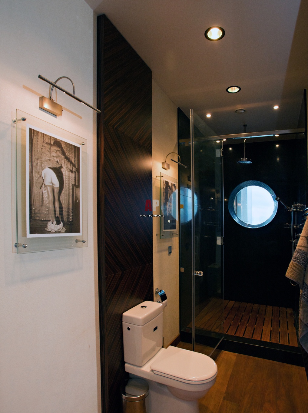 Фото интерьера санузла офиса. В санузле есть душевая кабина. Она облицована панелями из дерева, изготовление «Коммодиум», и напоминает интерьер дорогой яхты. Завершающий штрих – окно-иллюминатор.