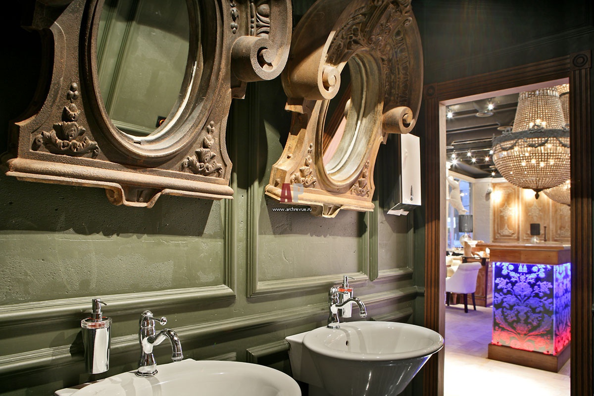Зеркала декорированы оригинальными рамами. Их роль выполняют слуховые чугунные окна, купленные на антикварном рынке в Париже.