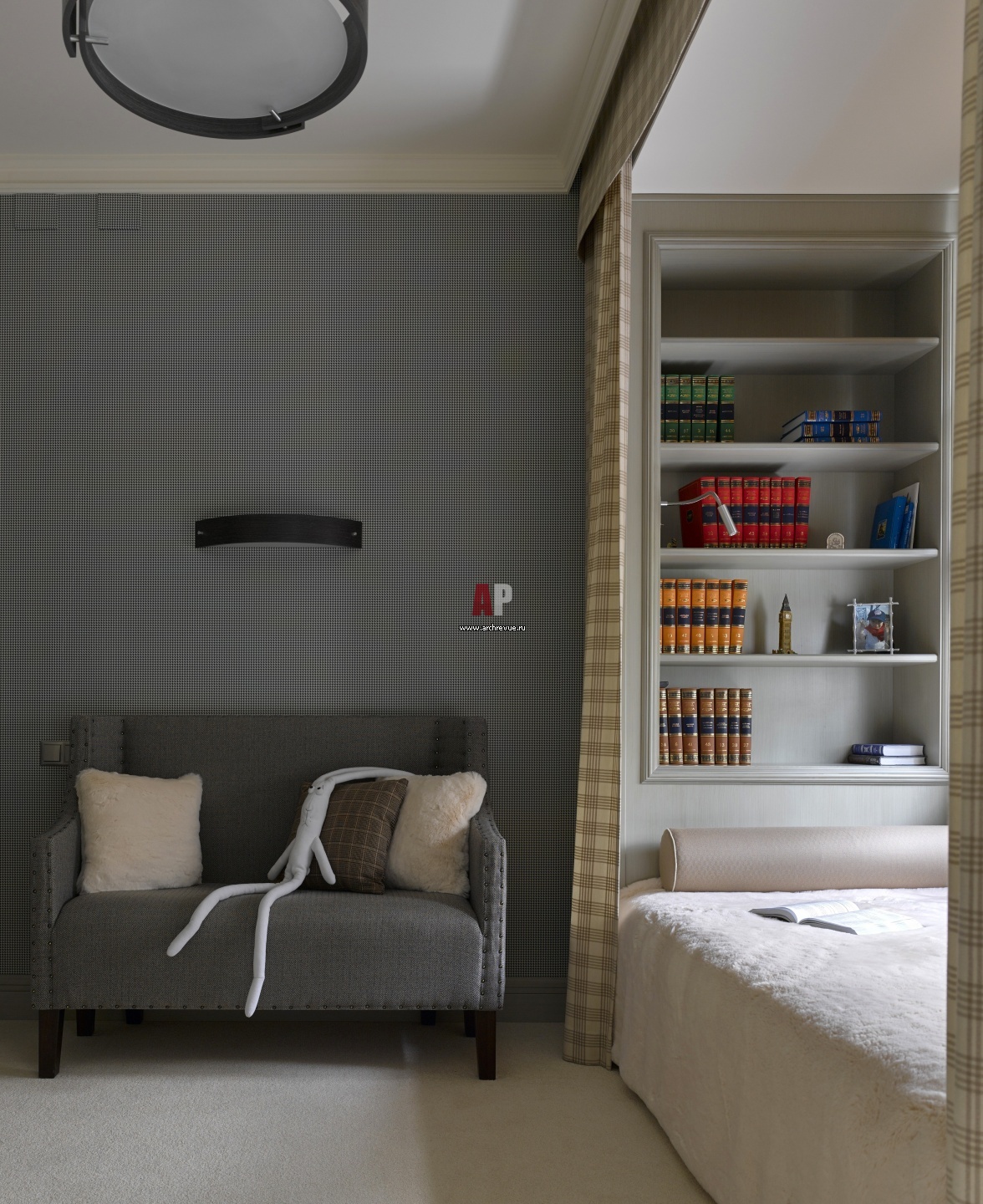 Кровать с альковом в одной из детских расположена возле окна. По обе стороны от нее размещены встроенные в стены стеллажи.