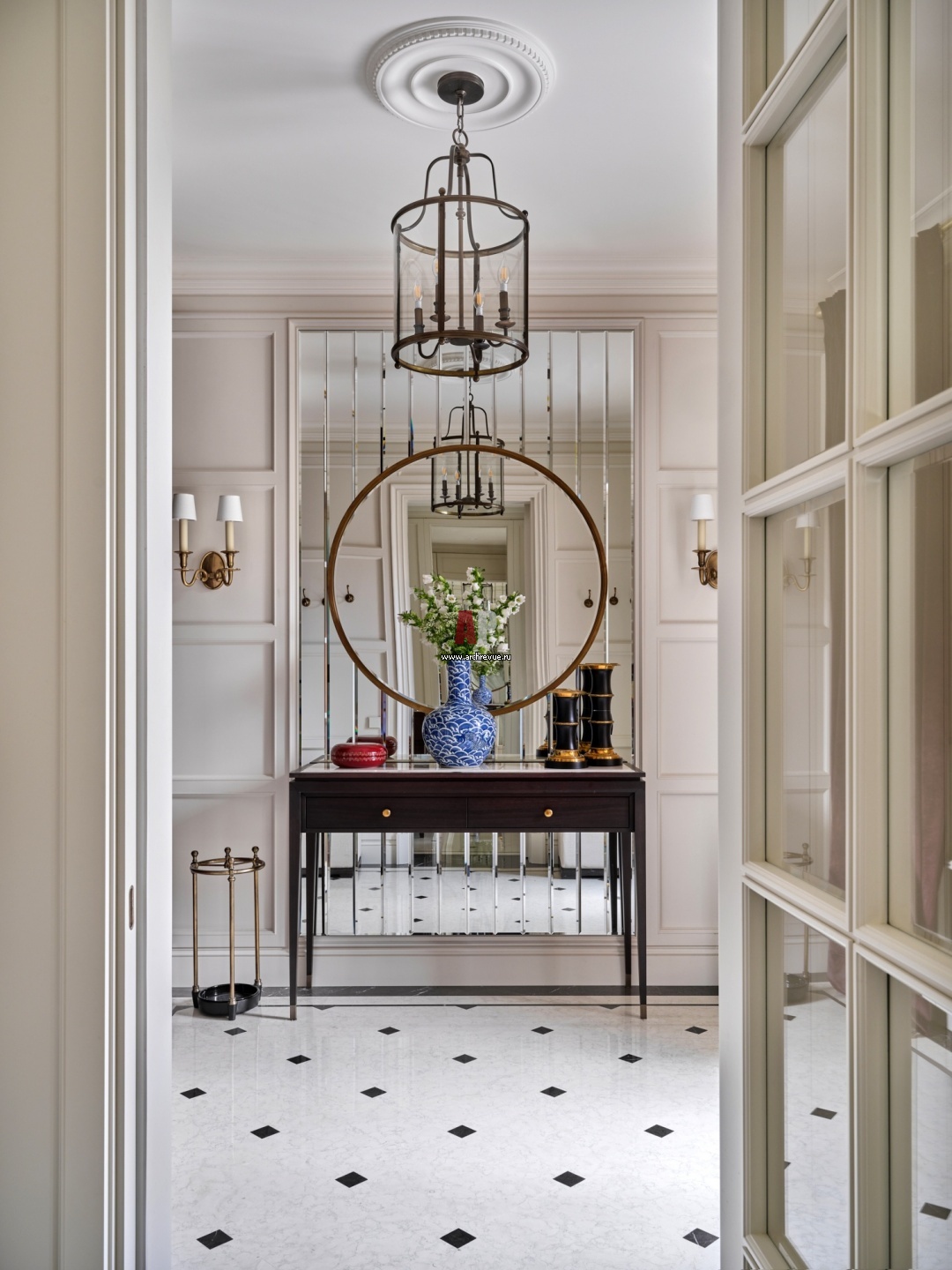 Прихожая. Зеркало с фацетами за консолью визуально увеличивает высоту помещения и создает парадный настрой. На полу – классическая раскладка из мрамора двух видов Crema Marfil и Nero Marquina.