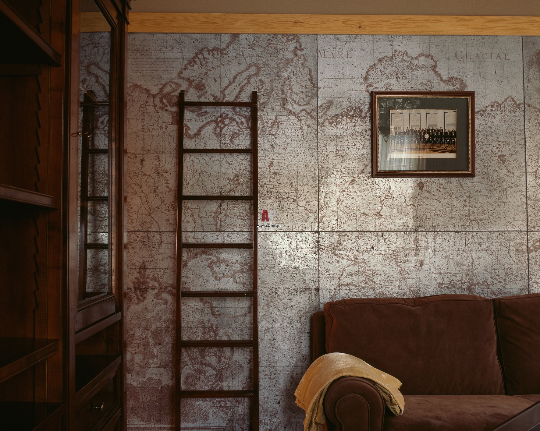 В кабинете декоративное панно. На стене фольга, на которую методом шелкографии нанесена старинная карта Российской империи.