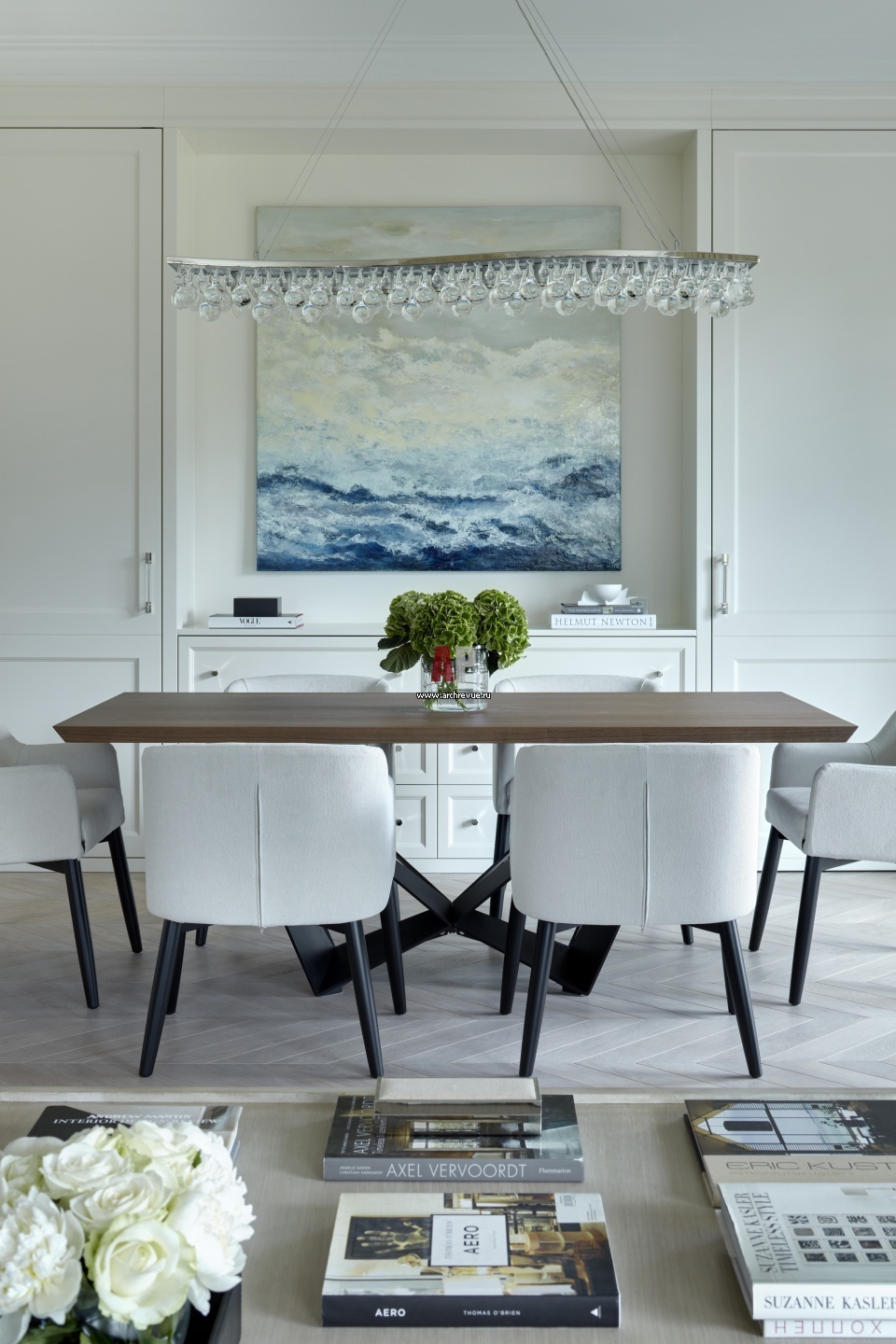 Светлая квартира в красках природы. Столовая зона в общей гостиной. Обеденный стол, Cattelan Italia. Стулья, Meridiani. Светильник, Ochre.
