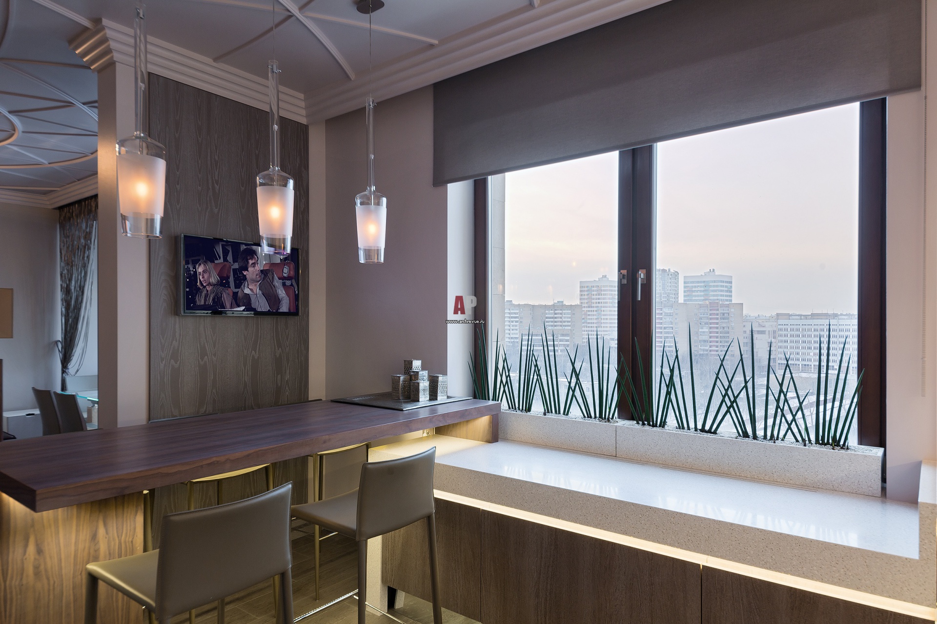 Интерьер кухни с барной стойкой в светлой цветовой гамме. Цветочные кадки выполнены из того же агломерата что и столешница, переходящая в подоконник, затем в уровень основной рабочей плоскости кухни и, конечном итоге, на стену в качестве защитного фартука.