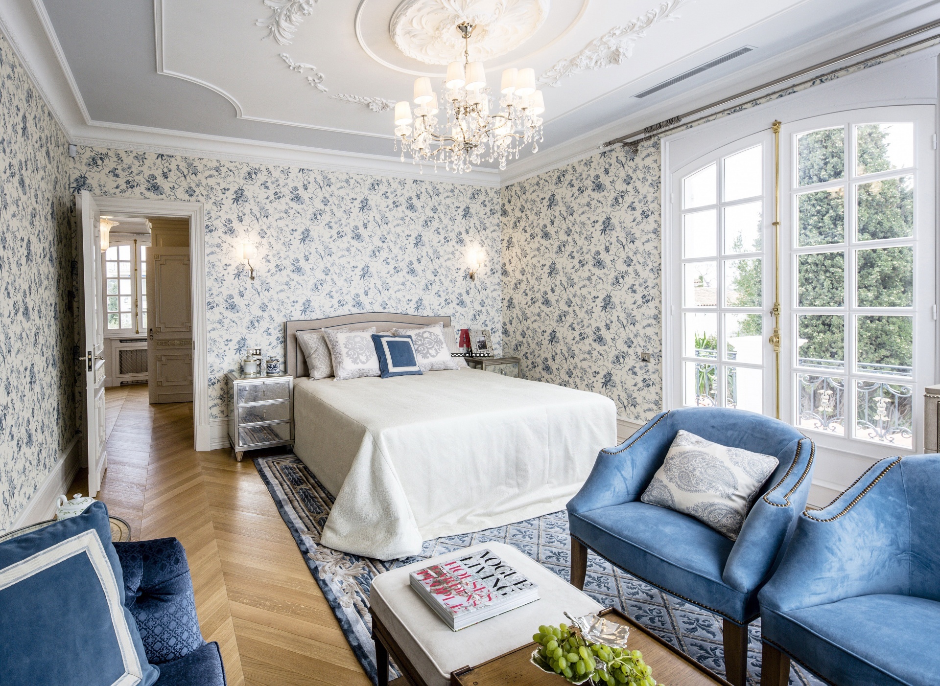 Роскошная вилла в стиле бель-эпок на побережье Франции. Интерьер спальни в бело-синих тонах. Кровать, Hypnos. Диван, комод, кофейный столик, Sherrill Furniture.
