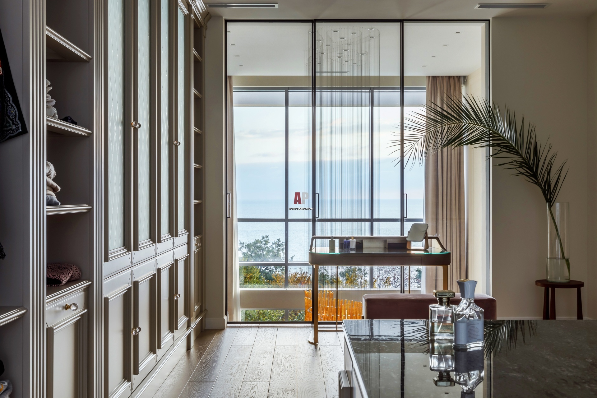 Гардеробная расположена на балконе второго этажа. Туалетный столик, Baxter.