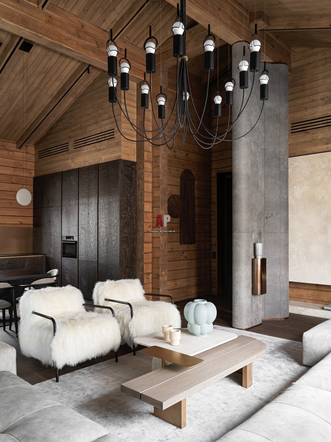 Высоту гостиной подчеркивают две колонны, декорированные натуральной кожей. «Поскольку дом из бруса, мы предусмотрели технологический зазор на усадку и сделали верхнюю часть кожаных панелей съемными. Это обеспечивает доступ к несущей конструкции для регулировки ее крепежей», - рассказывают авторы проекта.