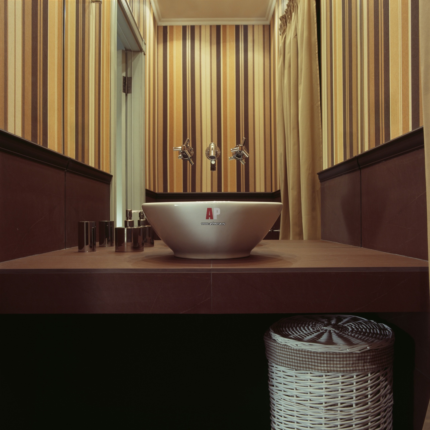 Стены в гостевом санузле оклеены полосатыми обоями. Такое решение делает небольшое помещение ярким и оригинальным.