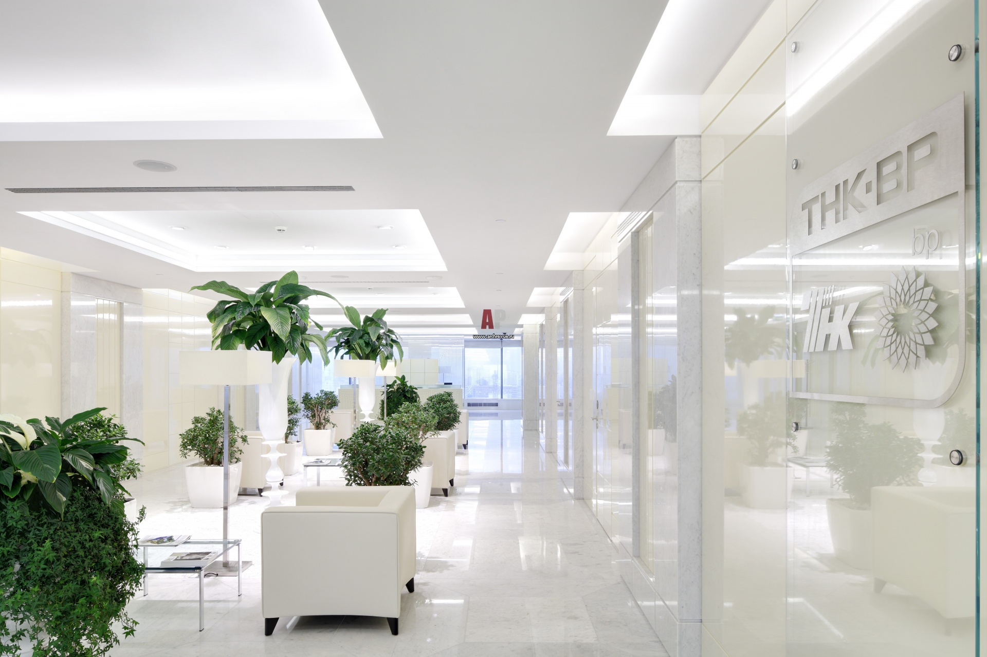 Интерьер входной группы этажа в молочно-белых тонах. Стены и пол облицованы белым камнем с серыми прожилками.