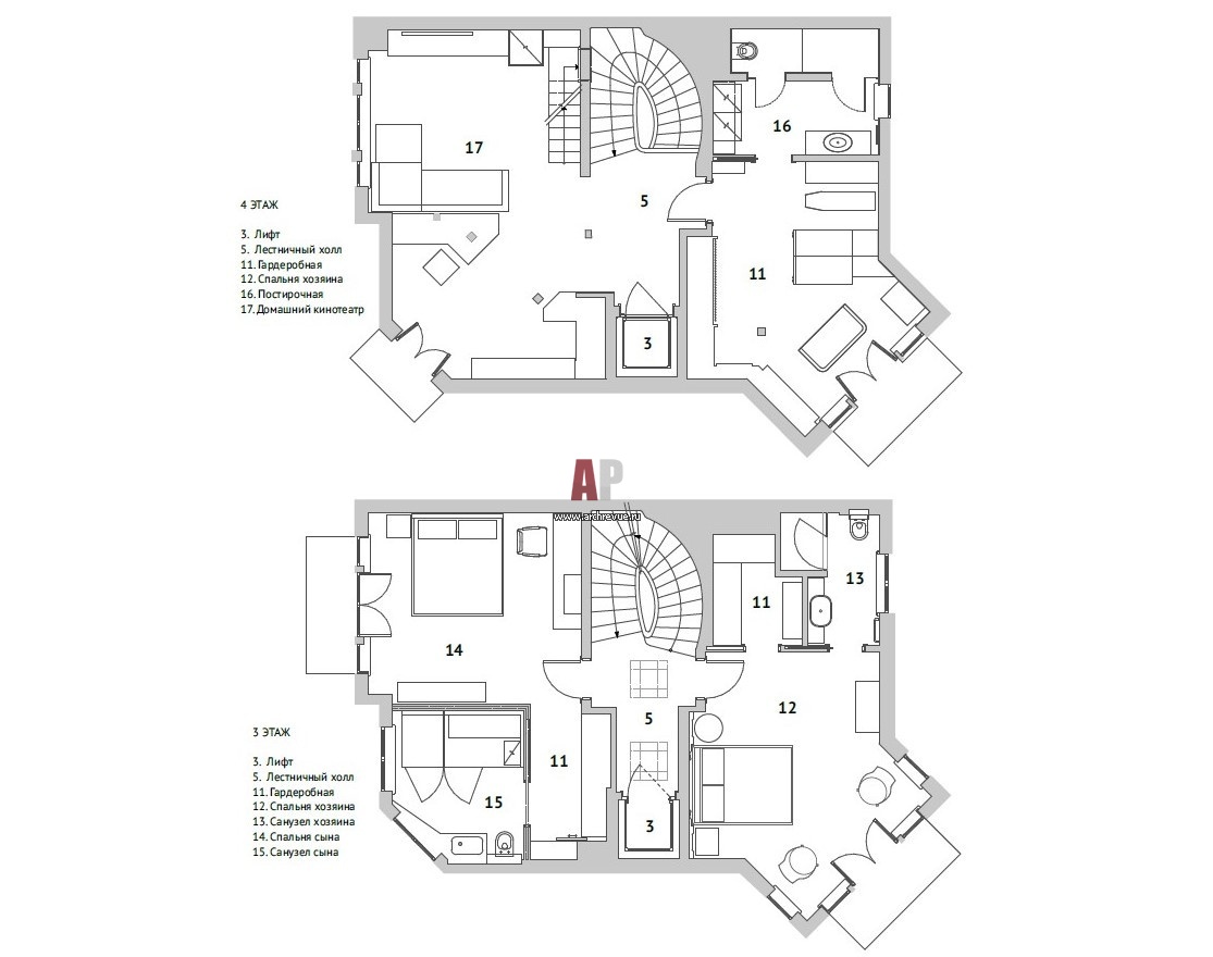 Планировка 3 и 4 этажа 4-х этажного дома в Подмосковье.