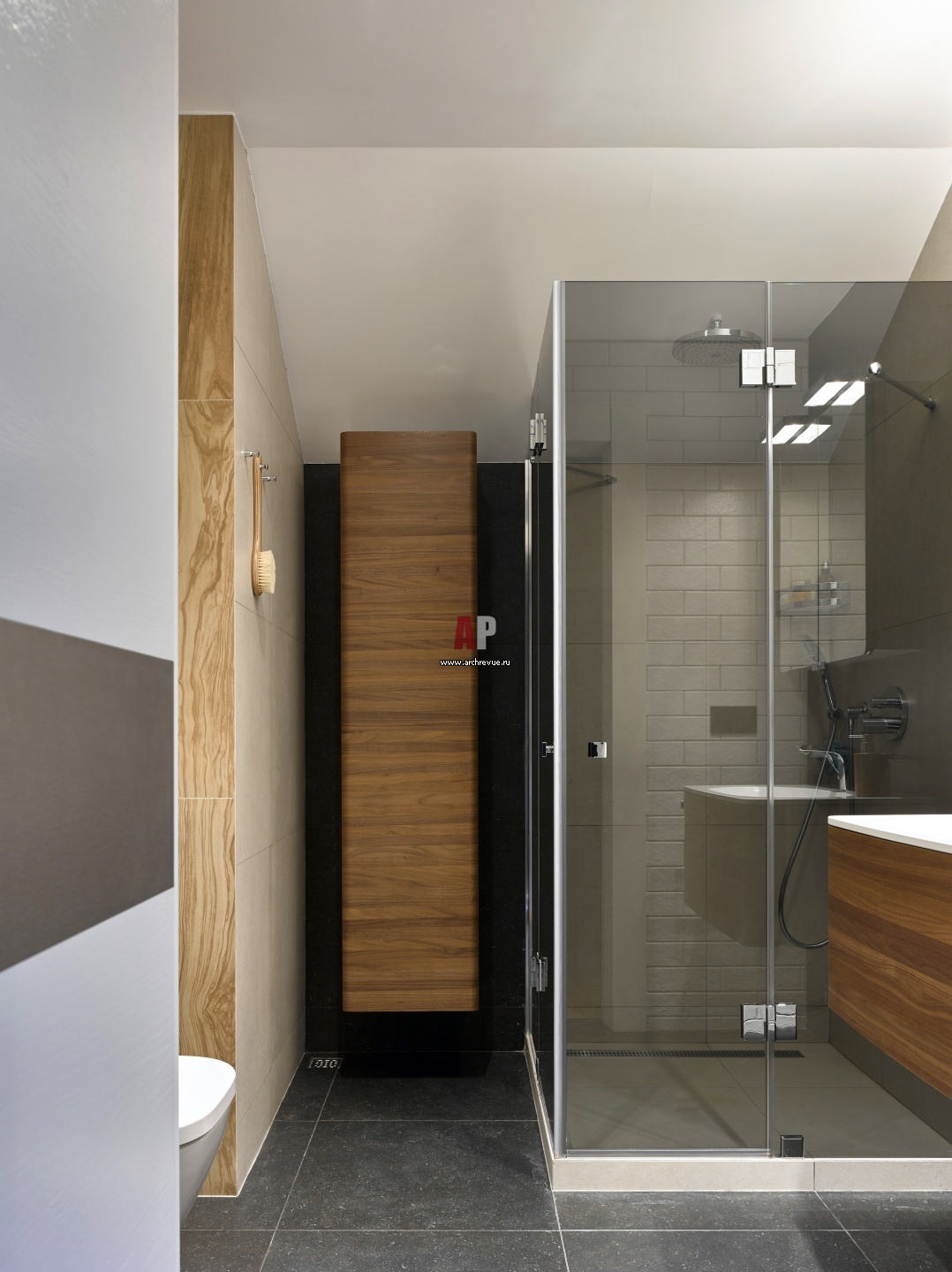 В мансардном санузле размещена компактная душевая. Одна стена отделана керамогранитом «под дерево». Его оттенок похож на тот, что используется в отделке основных помещений.