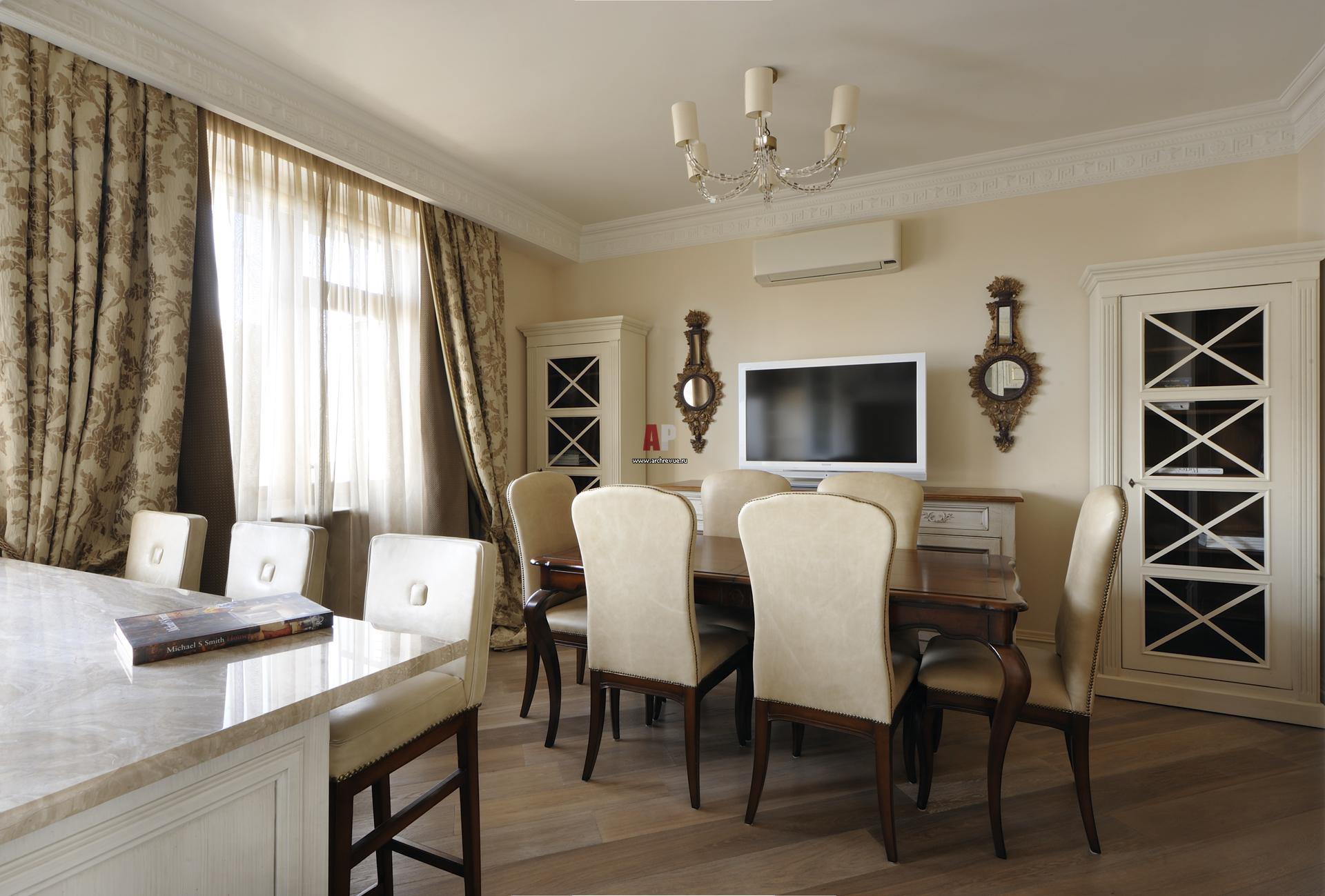 Объединив в общей зоне столовую с кухней, автор зрительно увеличила это небольшое помещение. Столовая оформлена по всем правилам: обеденный стол, комод для приборов и витрины для посуды. Здесь же и панельТВ, специально предусмотренная для гостей.