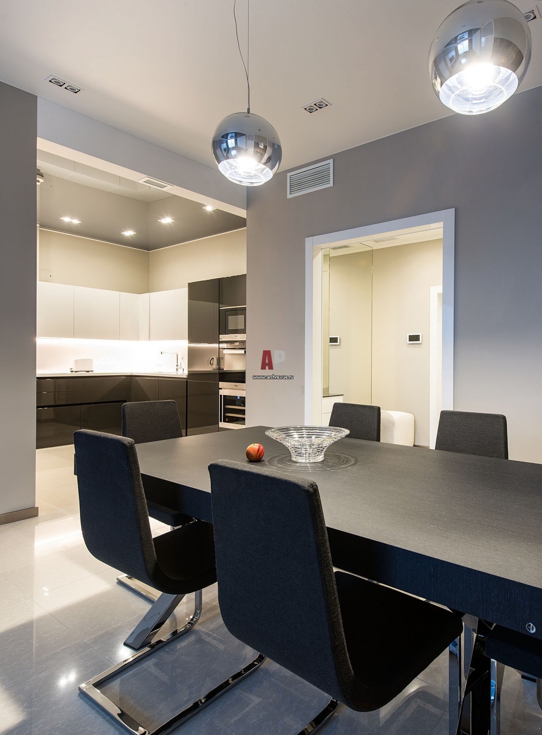 Кухня в общей гостиной размещена в нише. Кухонная мебель, Scavolini.