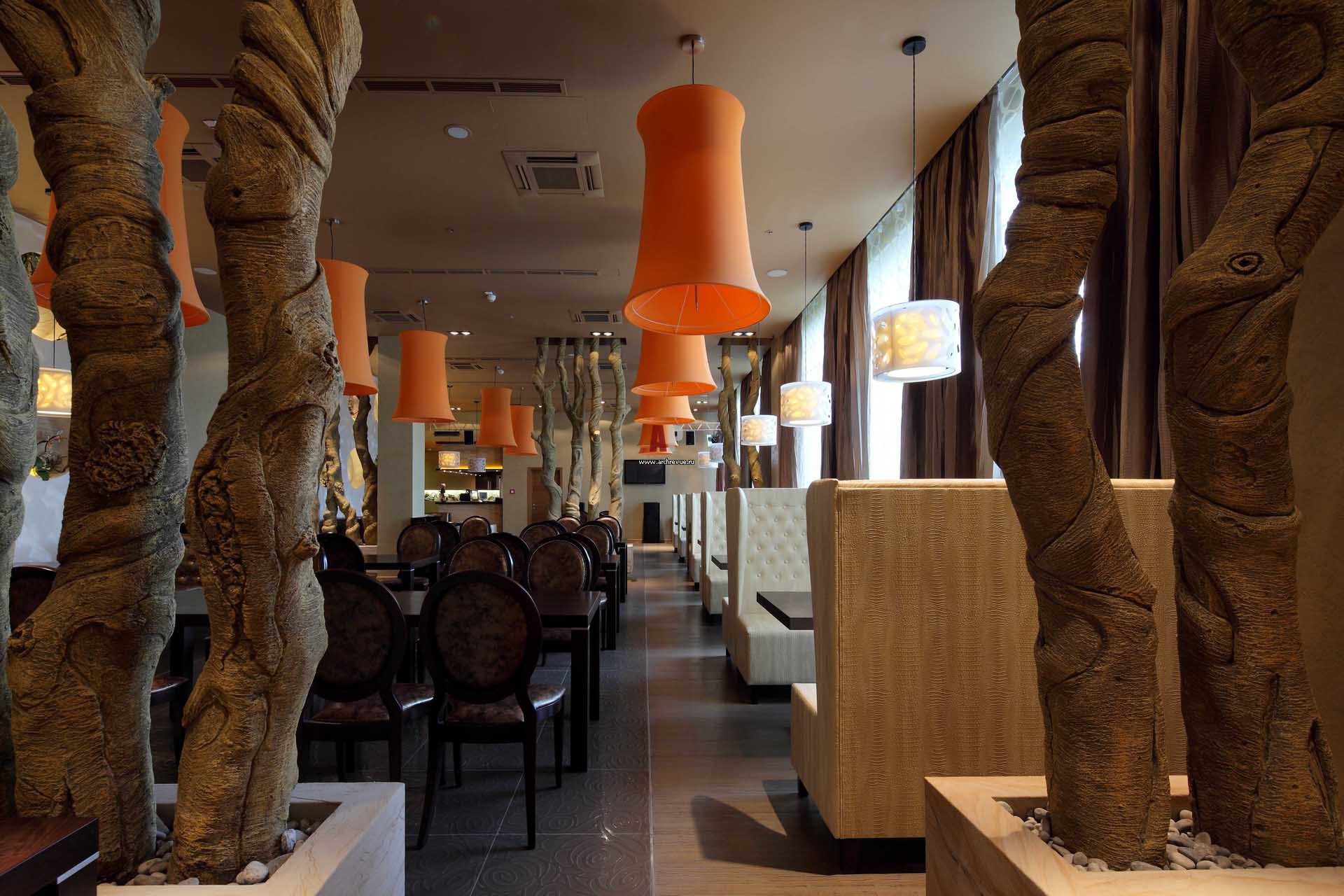 В интерьере ресторана обыгрывается пластика стволов деревьев. Они выполнены из архитектурного бетона и зонируют пространство.