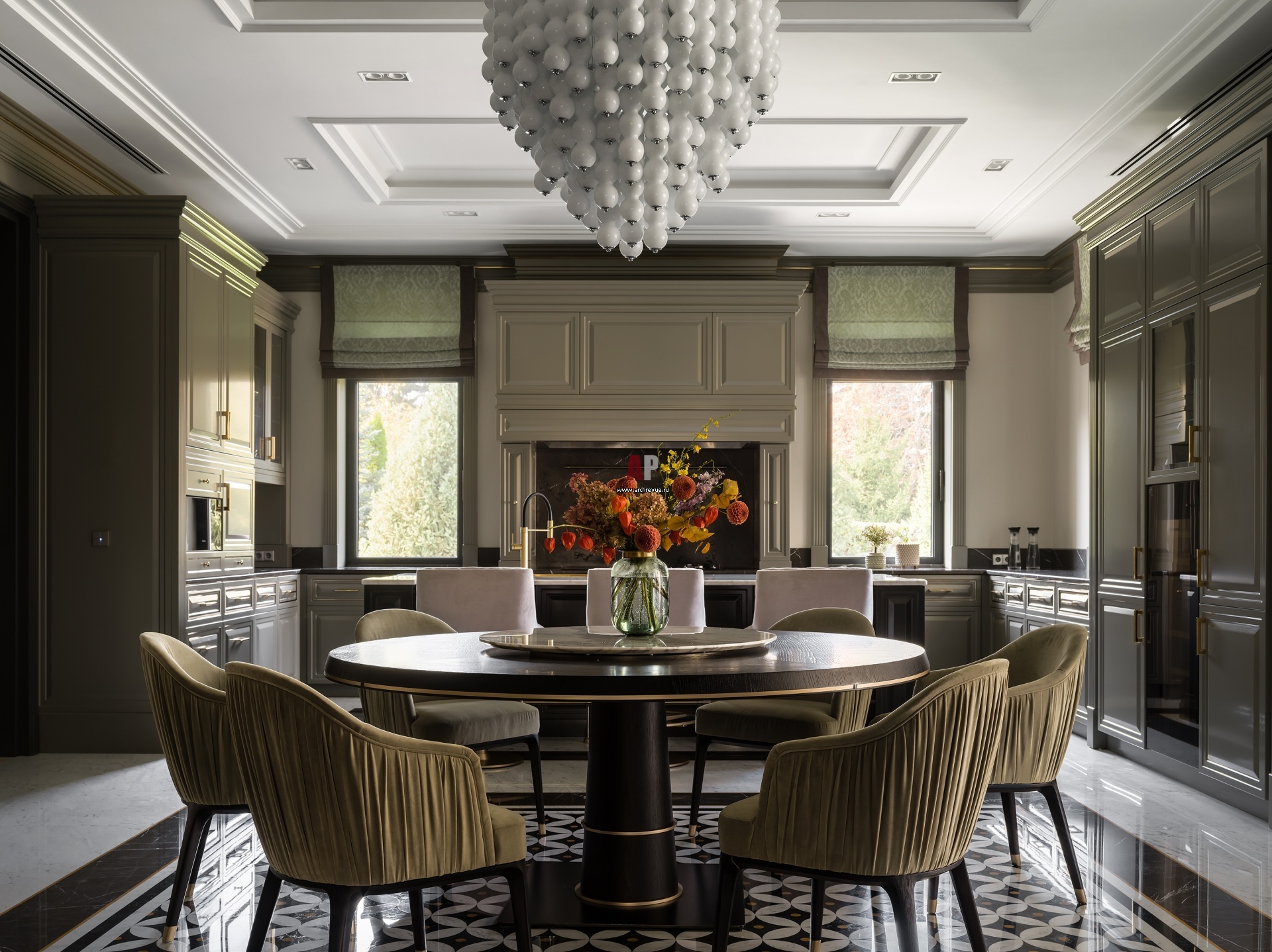 Респектабельная вилла в духе современной классики. Интерьер кухни с зоной для завтраков.