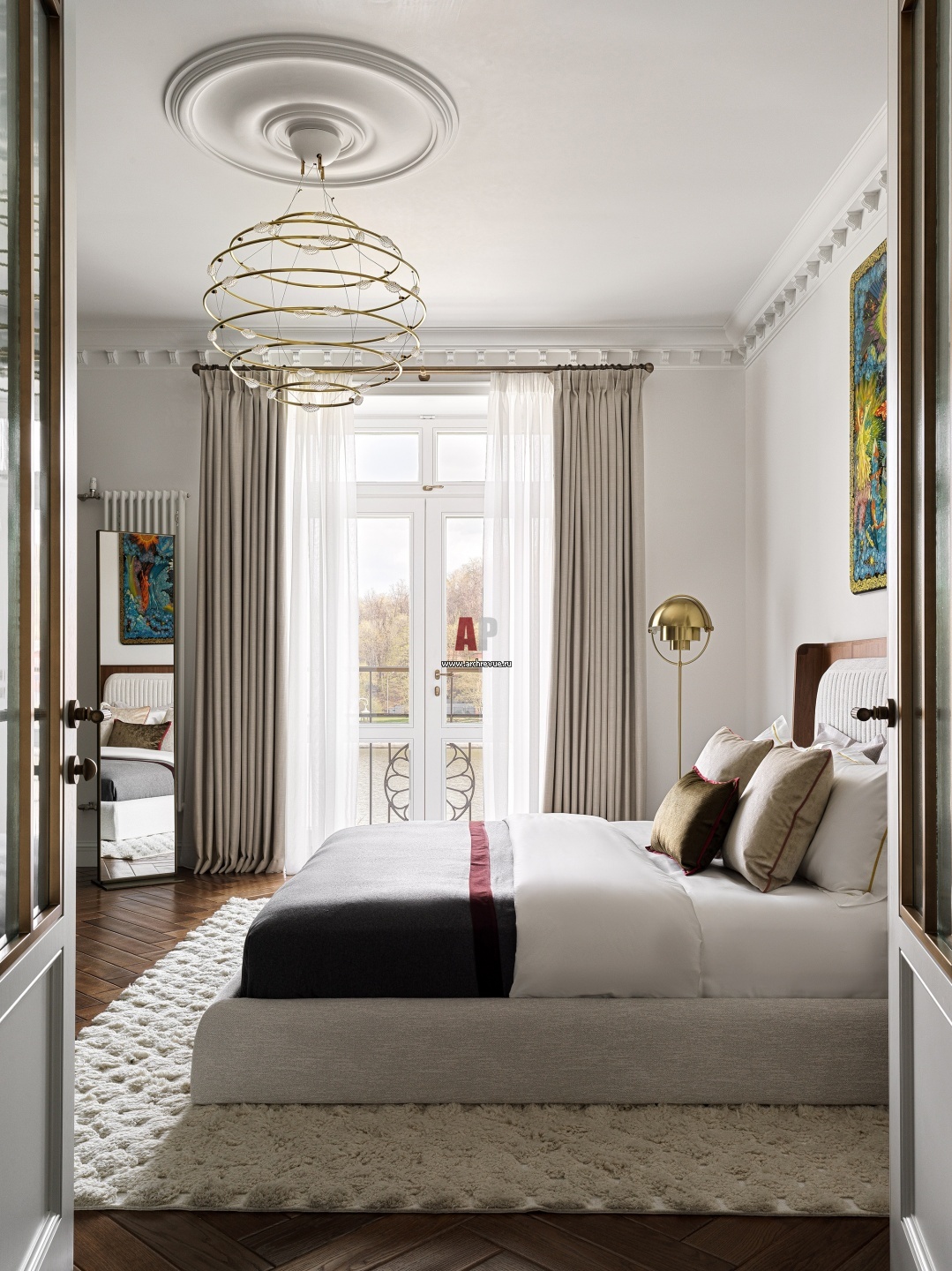 Спальня. Карниз повторяет внешние карнизы сталинских домов. Потолочные розетки выбрали минималистичные, так как люстра достаточно декорированная. Люстра, Catellani & Smith.
