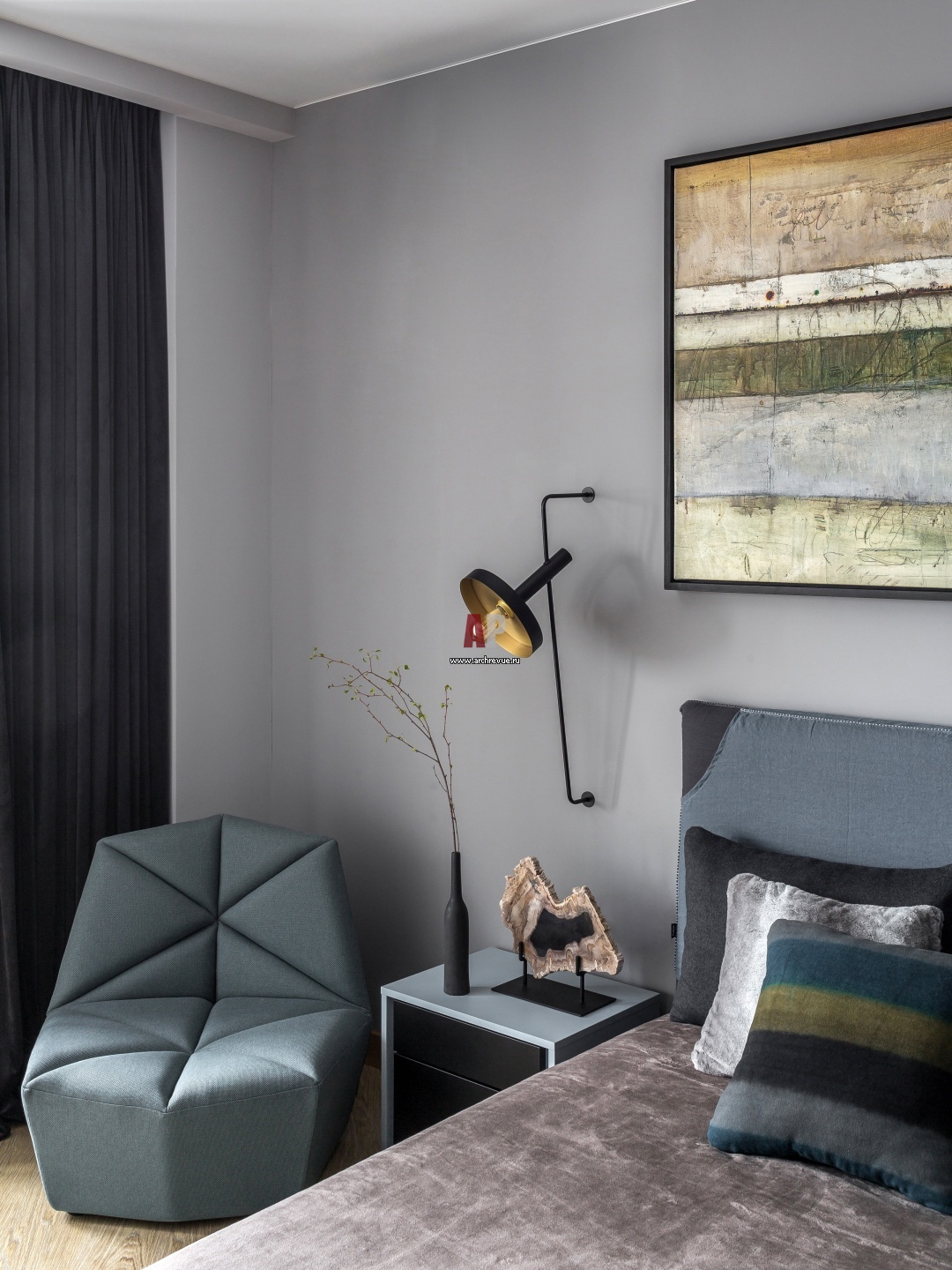 Фото интерьера мужской спальни в серых тонах.