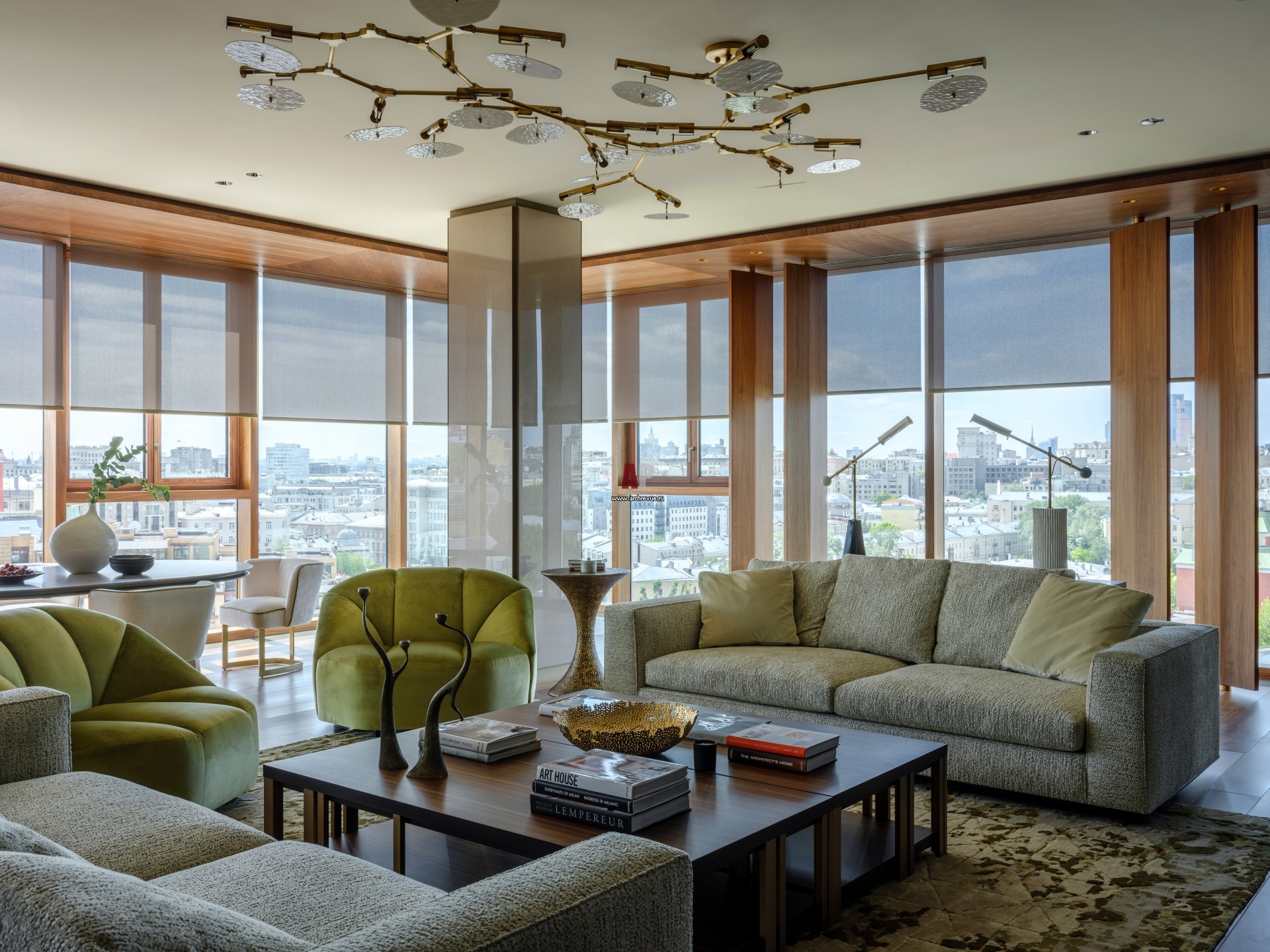 Гостиная с панорамными окнами. Кресла, Gallotti & Radice в обивке тканью Pierre Frey. Диваны, Minotti в обивке тканью Pierre Frey. Журнальные столики, Emmemobili. Ковер, Gorlan. Несущие колонны зашиты МДФ со стеклом и растворяются в объеме.
