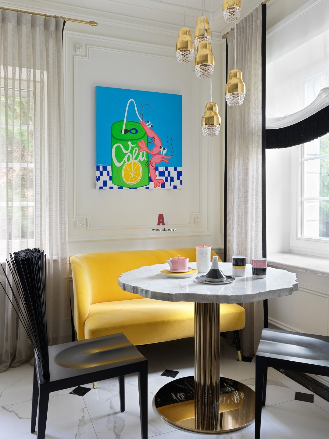 Кухня. Зона для завтраков у окна с мягким диваном, DOM Edizioni. На стене – картина Романа Манихина «Одна креветка подсаживает другую на Coca-cola». Круглый стол из светлого кварцита с необработанным краем выполнен по эскизам дизайнера. Керамика на столе художника Дмитрия Султанова. Светильники-матрешки над столом, Axo Light, по дизайну Димы Логинова.