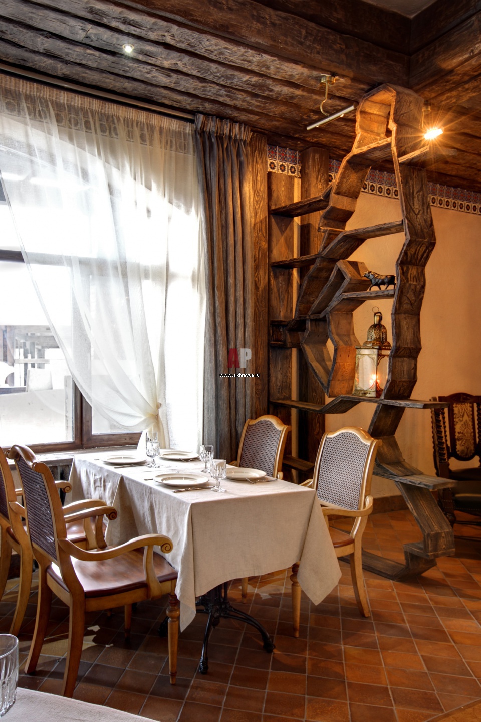 Столики зонированы оригинальными стеллажами в виде гнутого дерева.