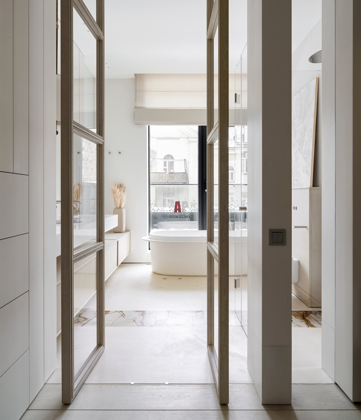 Женский санузел отделен витражными перегородками. На полу и на стенах использованы натуральный светлый известняк и кварцит.