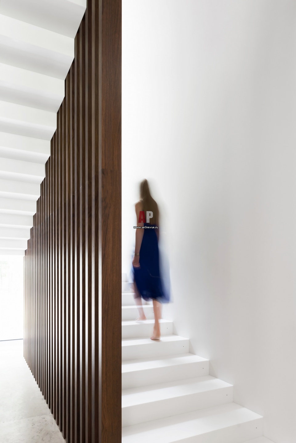 Дом с современной архитектурой в Жуковке. Лестница на второй этаж отделена реечной перегородкой.