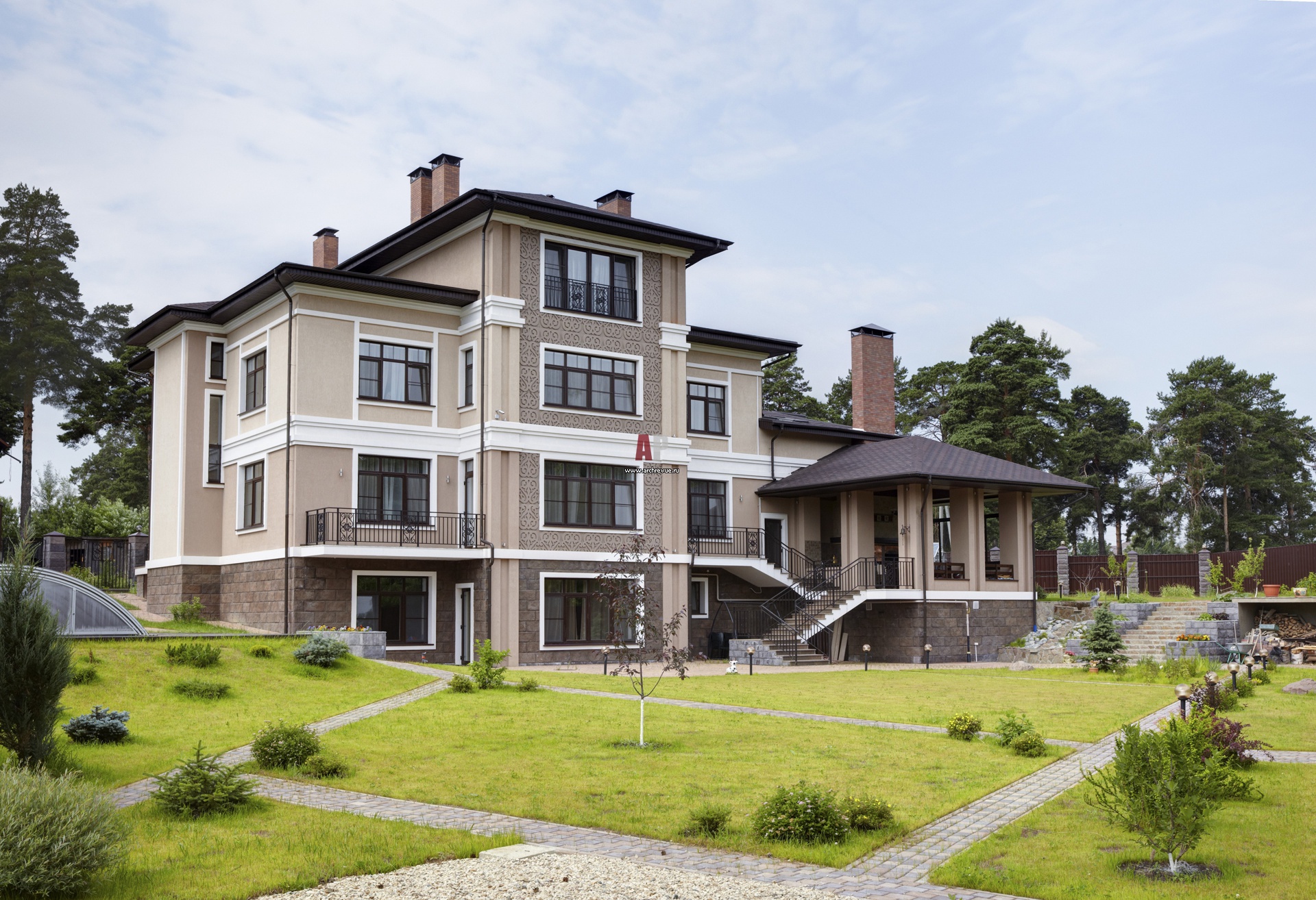 Большой дом площадью 1000 кв. метров растянут по участку. С помощью разных вариантов отделки (штукатурки, облицовки искусственным камнем, оформления каменными ажурными плитами) и структурированности по вертикали он смотрится стройнее. Планировка дома такова, что максимальное количество помещений и окон ориентировано на участок, за которым виден лес и река.