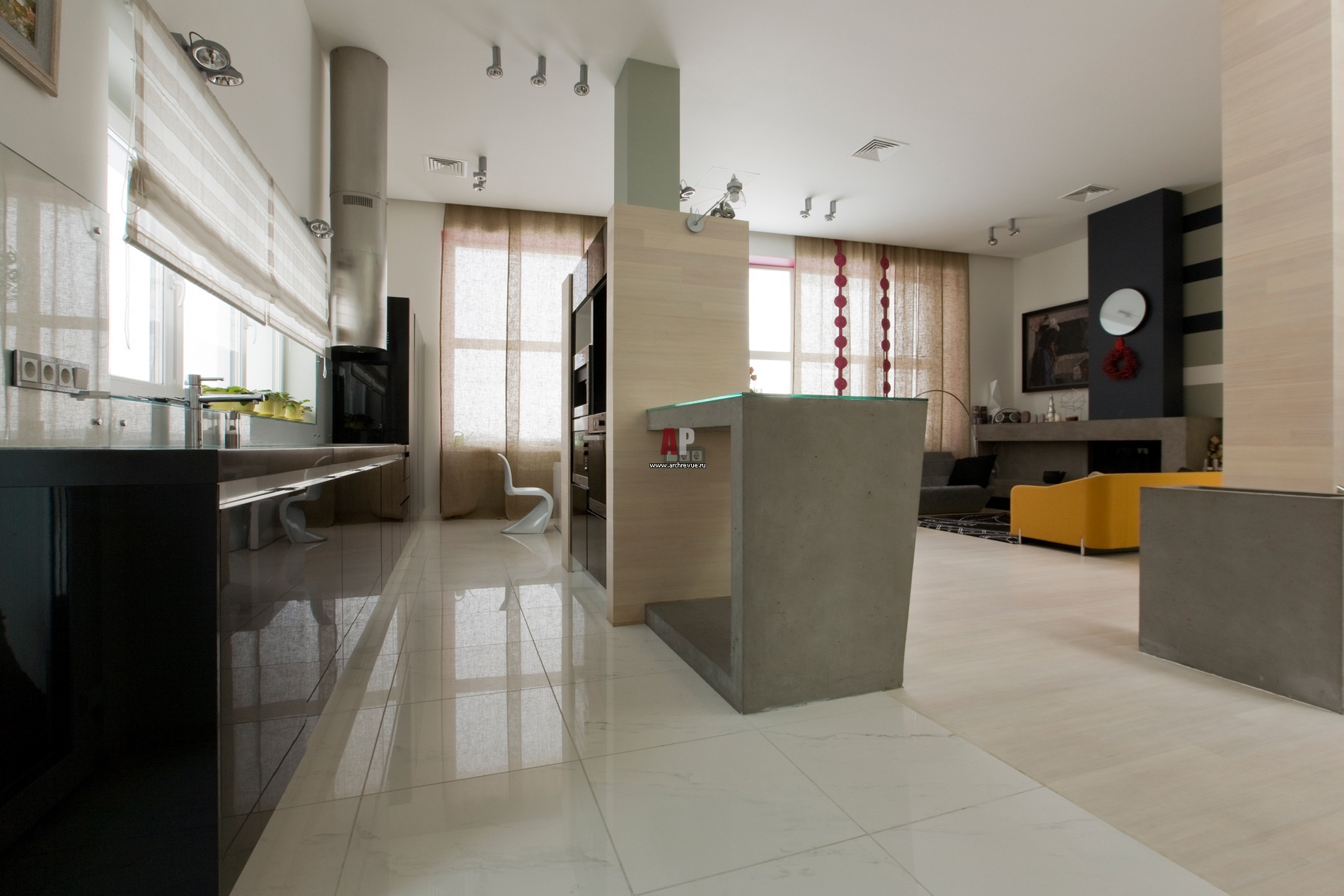 Барная стойка в форме скобы выполнена из бетона строительным способом. Авторы проекта Петр Зайцев, Арсений Борисенко, архитектурное бюро za bor.