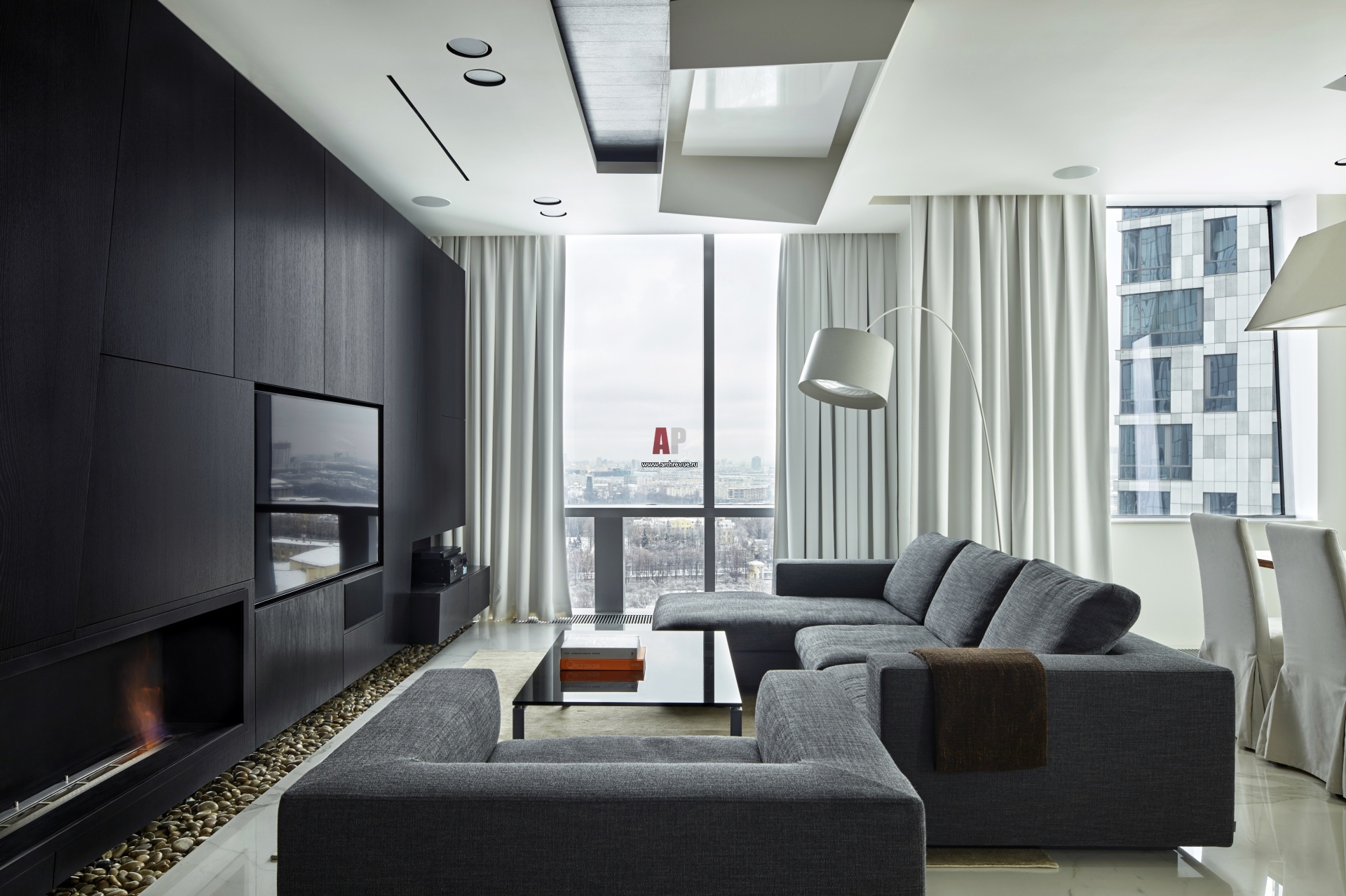 Зона ТВ в гостиной. Модульный встроенный шкаф во всю стену выполнен по эскизам архитекторов. Модульный диван, Walter Knoll, модель Landscape. Кресло, Walter Knoll, модель Living Landscape 750. Торшер, Foscarini.