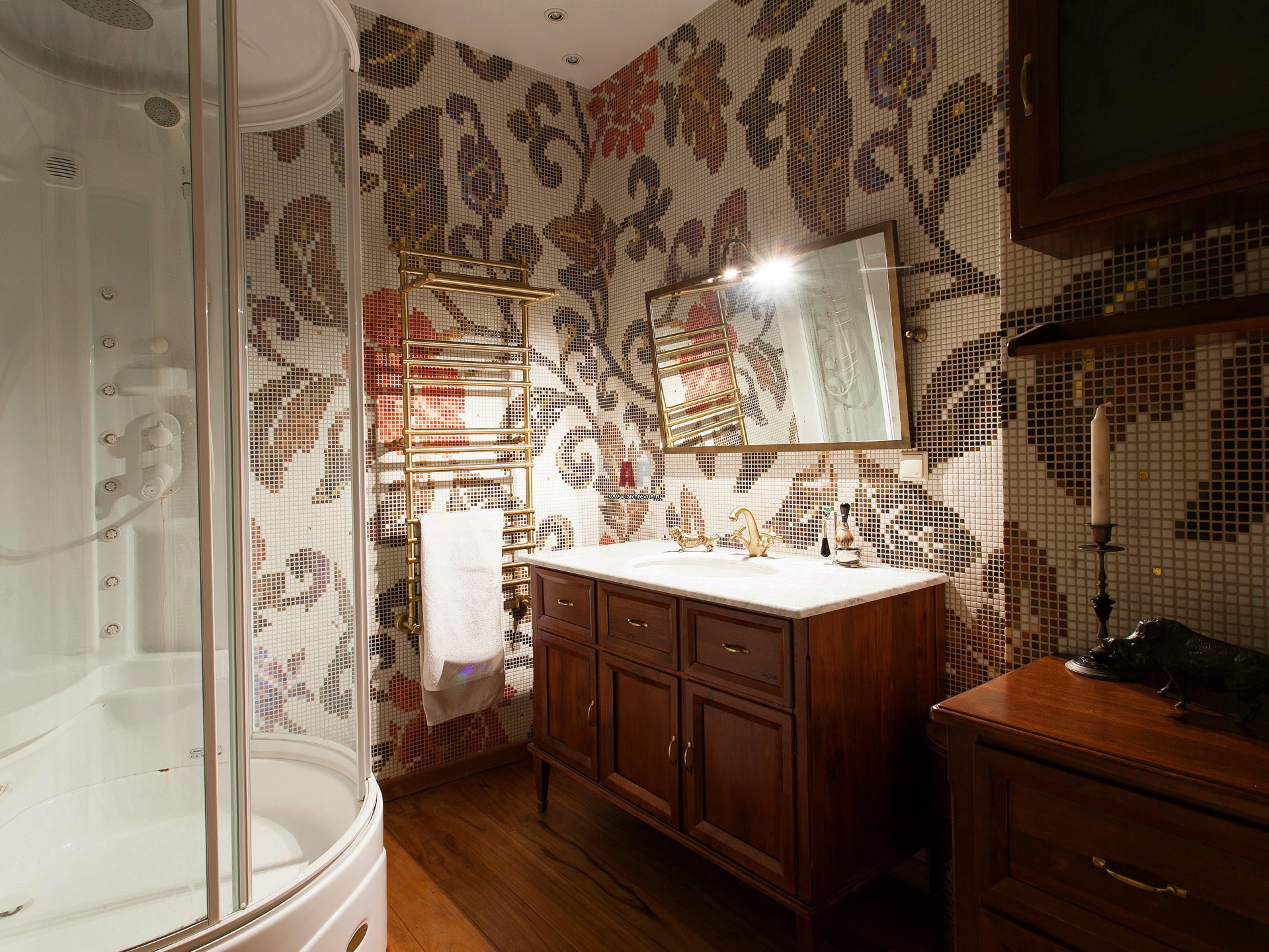 Ванная комната в отделке мозаикой Sicis и сантехникой Devon & Devon в английском стиле.