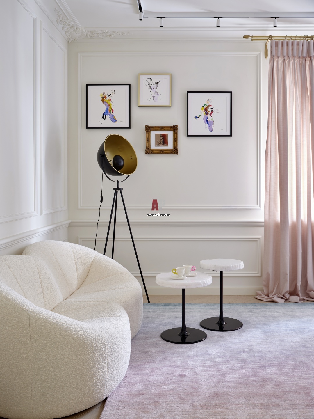 Хозяйская спальня. Стены выкрашены матовой краской, Dyrup, колеровка по RAL 9010, теплый белый цвет. Белый диван из шерстяного букле, Ligne Roset, по дизайну Пьера Полена. Кофейные столики из металла и мрамора сделаны под заказ по эскизам автора. Картины французских мастеров Анны Ди Крешенцо (также известной как Крессанна) и Франсуа Саук.