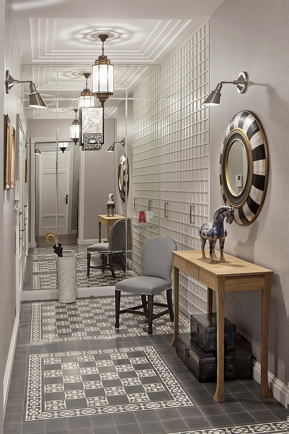Интерьер прихожей. На полу – цементная плитка в серо-жемчужной гамме, орнамент в стиле ар-деко, поставщик «Грета Вульф».
