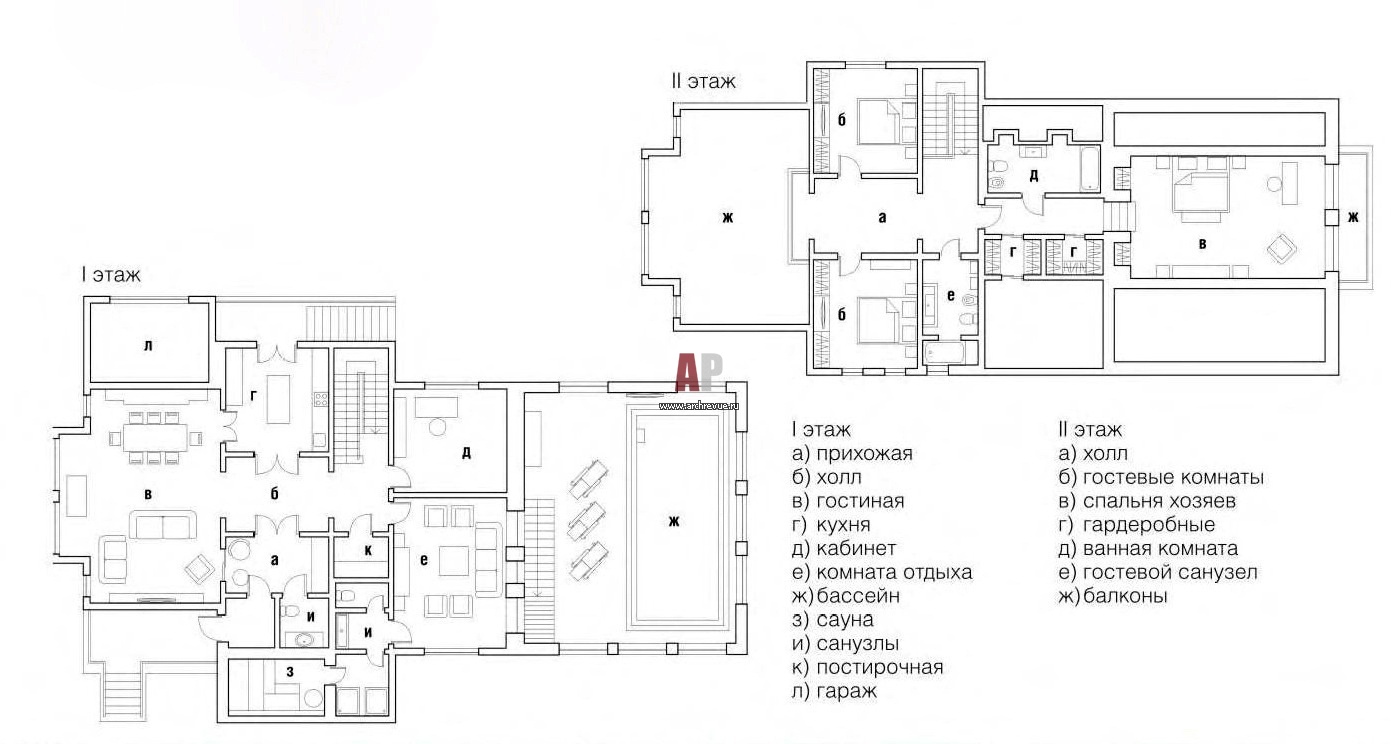 Поэтажный план двухэтажного деревянного дома с расстановкой мебели.
