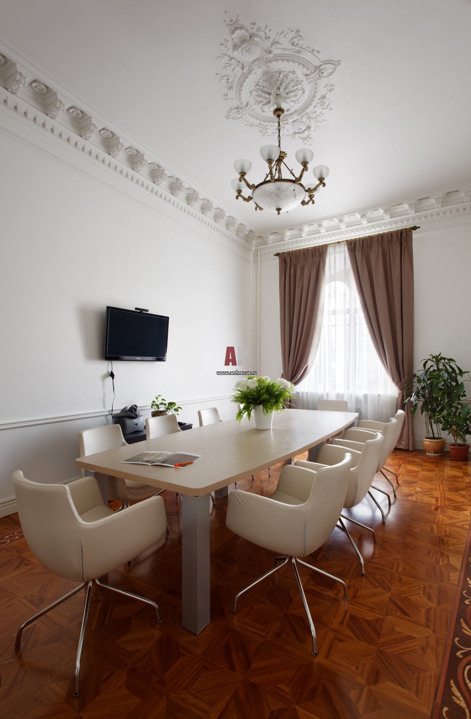 Зона для оперативных совещаний. Стол, кресала из бежевой кожи в современном стиле.