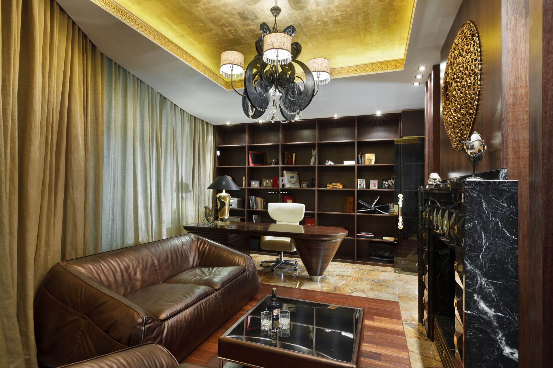 Зона кабинета-библиотеки в ситле ар-деко с камином. Письменный стол, Giorgetti. Диван, Gamma Arredamenti. Центральная часть потолка декорирована сусальным золотом. Лепные карнизы выполнены на заказ.