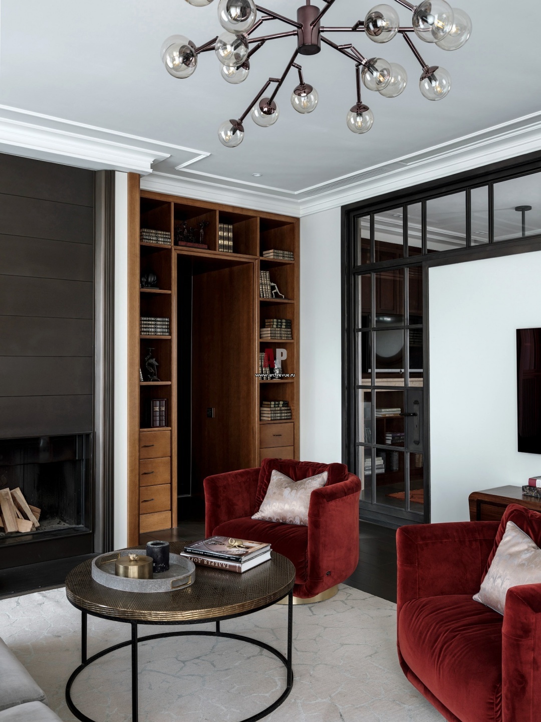 К гостиной примыкает кабинет, он отделен брутальной перегородкой из черного металла с прозрачными витражами. Люстра, Arteriors.