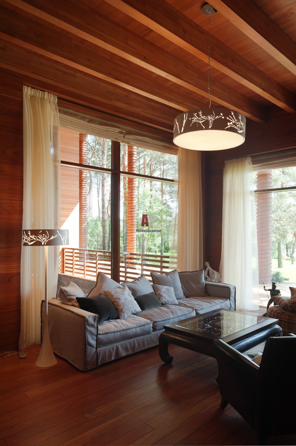 Интерьер гостевой комнаты. Шторы, обивка диванов и кресел выполнены из натуральных материалов теплых пастельных оттенков.