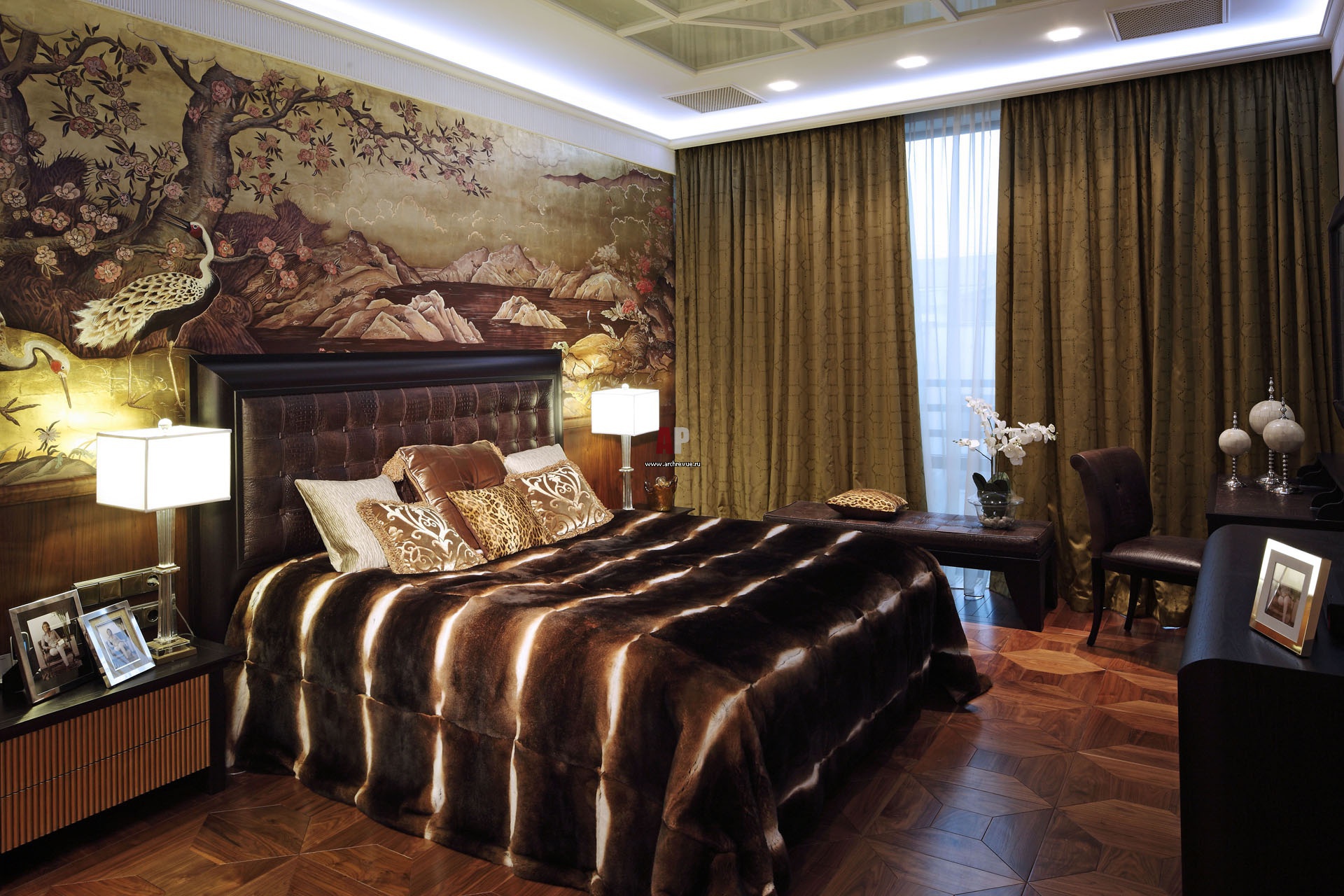 Роскошная спальня в стиле ар-деко. Стена за изголовьем кровати украшена авторской росписью. Роспись по золоту с изображением журавлей. На потолке – витраж с пескоструйным орнаментом.