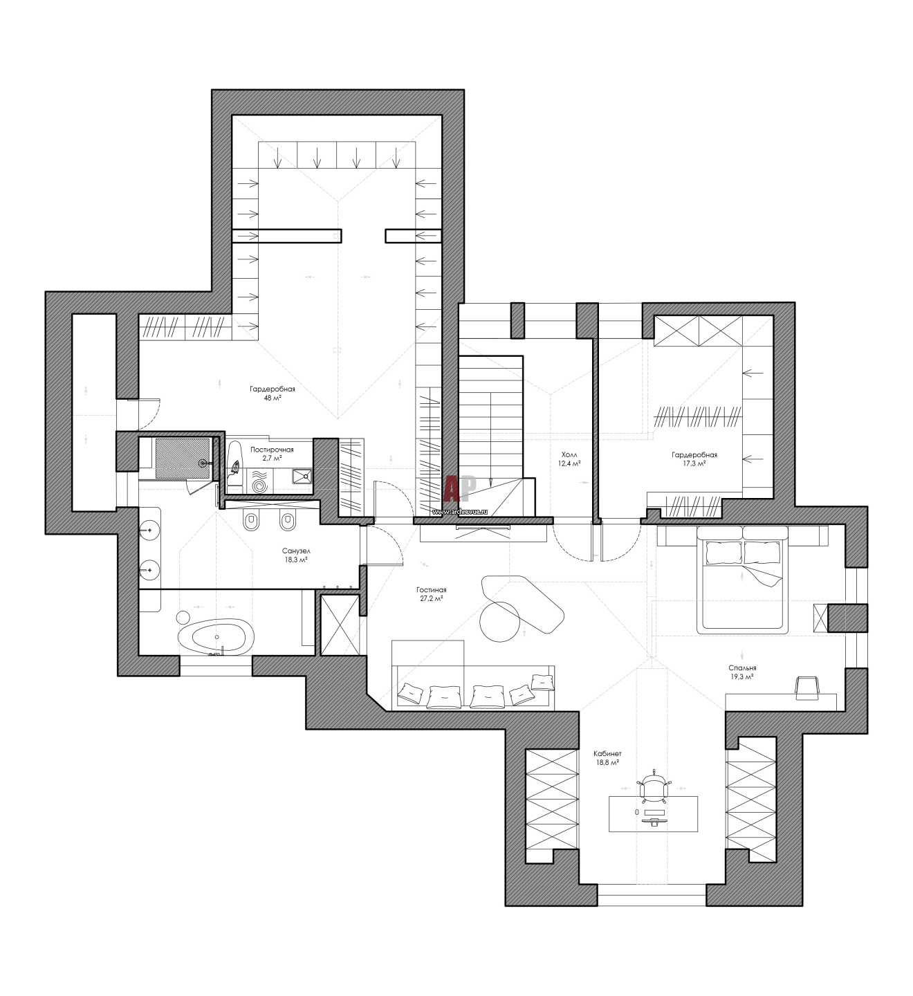 Перепланировка 3 этажа 3-х этажного коттеджа. Общая площадь – 530 кв. м.