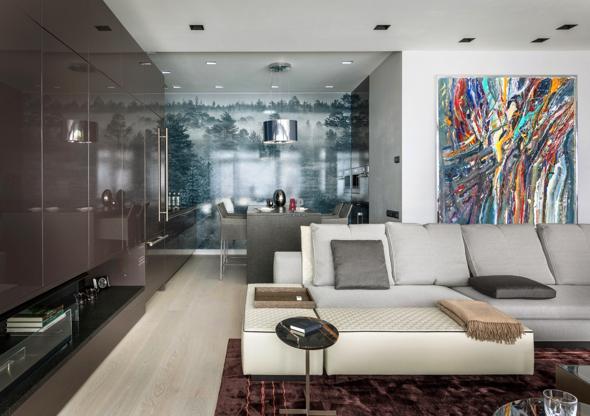 Минималистичный интерьер квартиры с современным искусством. Кухня расположена в нише, но визуально объединена с гостиной глянцевыми мебельными фасадами. Яркий цветовой акцент – живописное полотно Аси Феоктистовой.