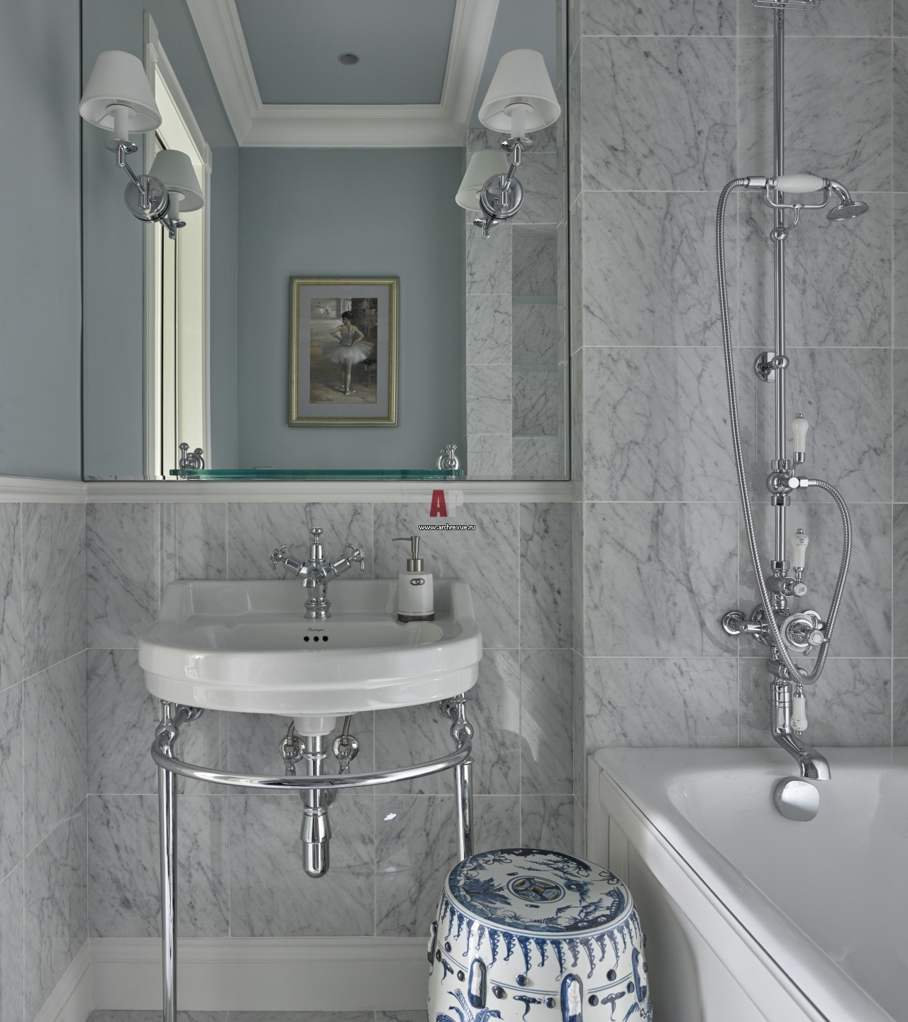 Интерьер детской ванной комнаты. Стены облицованы серо-голубом мрамором Bianco Carrara.