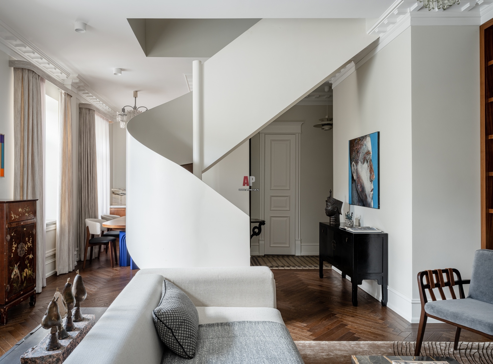 Скульптурная лестница зонирует гостиную-кухню. Ограждение лестницы выполнено из толстого листа металла, окрашенного в белый цвет.
